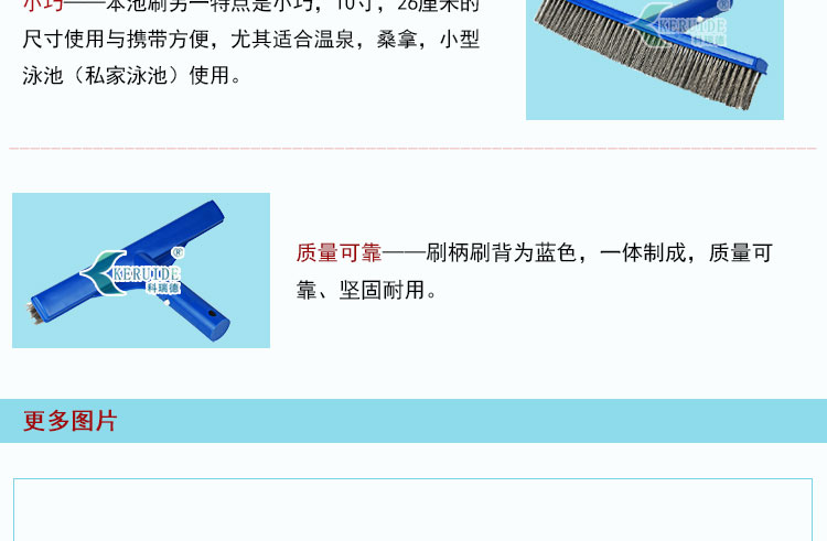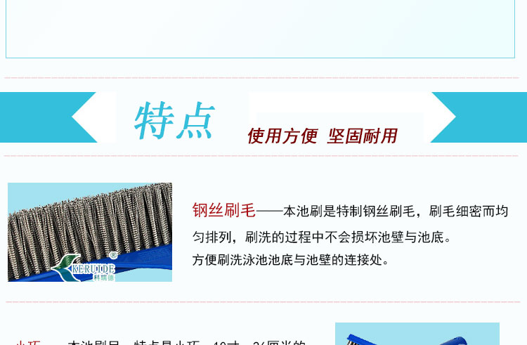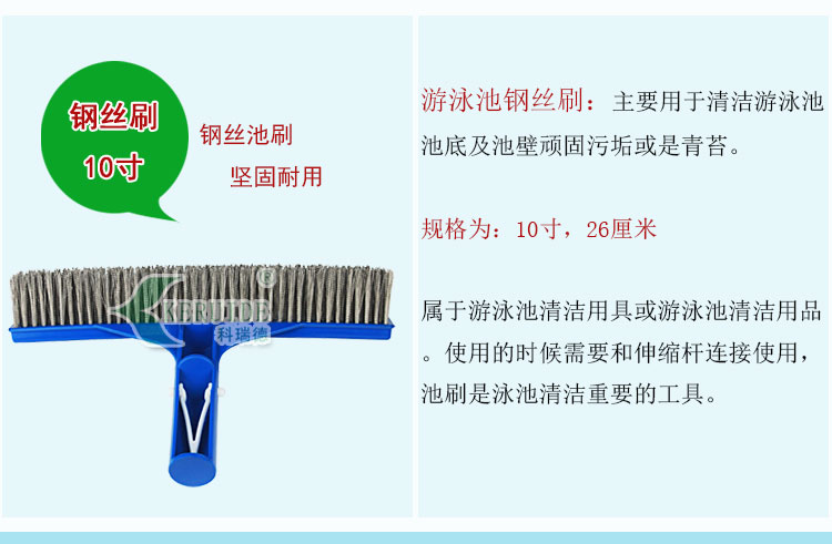 本池刷是特制鋼絲刷毛,刷毛細(xì)密而均勻排列,能有效刷洗池底及池壁頑固的青苔,使用過(guò)程中不會(huì)傷害池壁與池底。