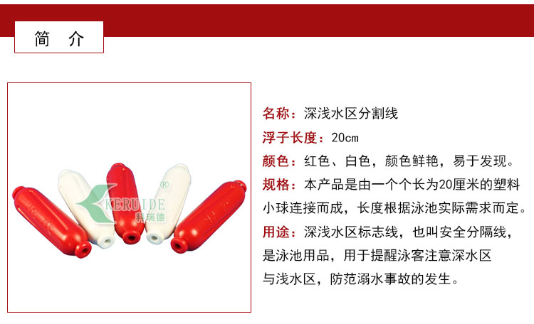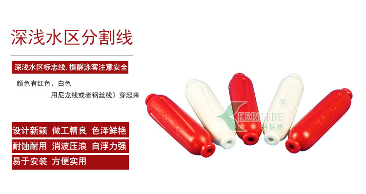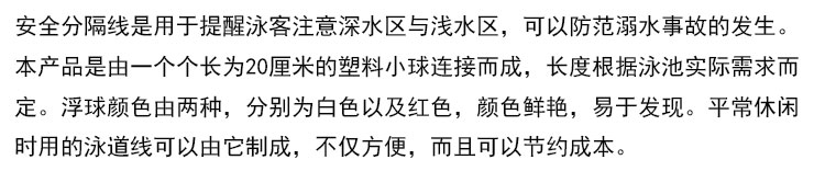 本產(chǎn)品是由一個個長為20厘米的塑料小球連接而成,長度根據(jù)泳池實際需求而定。浮球顏色由兩種,分別為白色以及紅色,顏色鮮艷,易于發(fā)現(xiàn)。