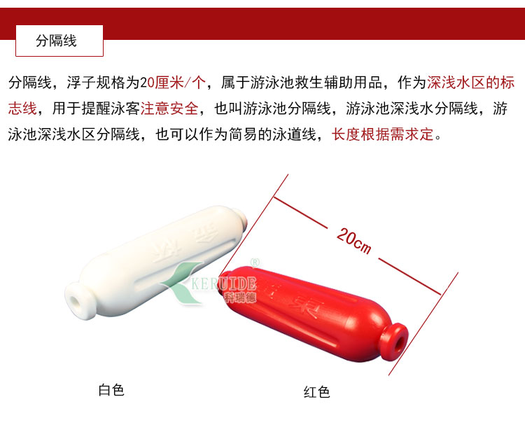 分隔線,規(guī)格為20厘米/個,屬于游泳池救生輔助用品,作為深淺水區(qū)的分道標志線,用于提醒泳客注意安全,也叫游泳池分隔線,游泳池深淺水分隔線,游泳池深淺水區(qū)分隔線,也可以作為簡易的泳道線,長度根據(jù)需求定。