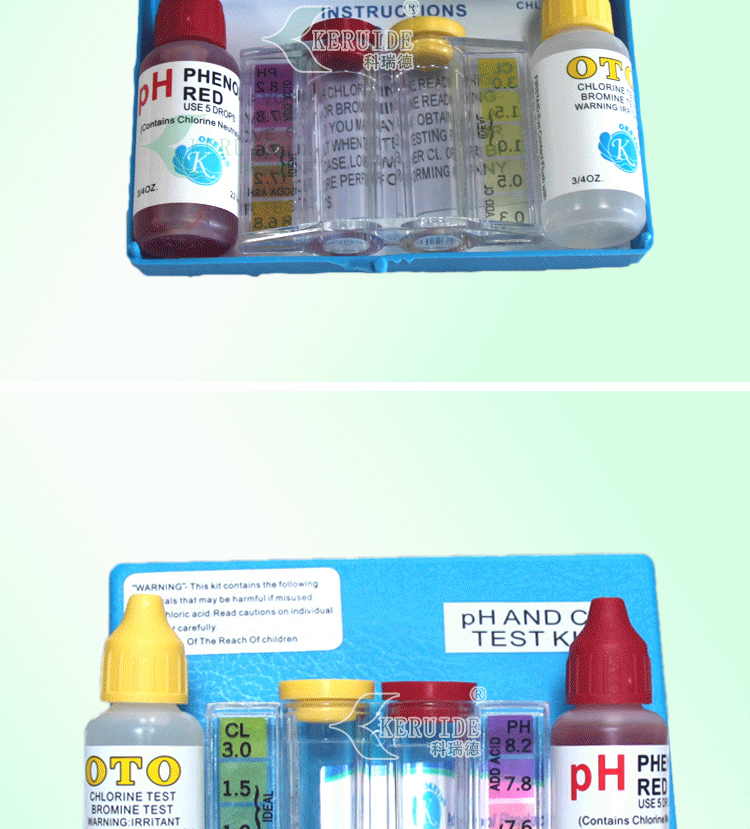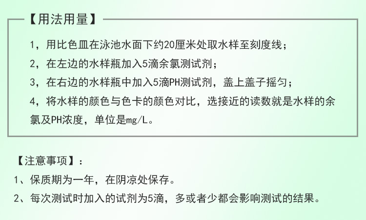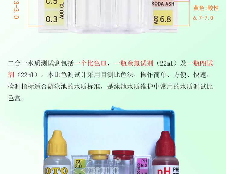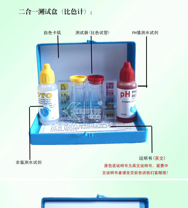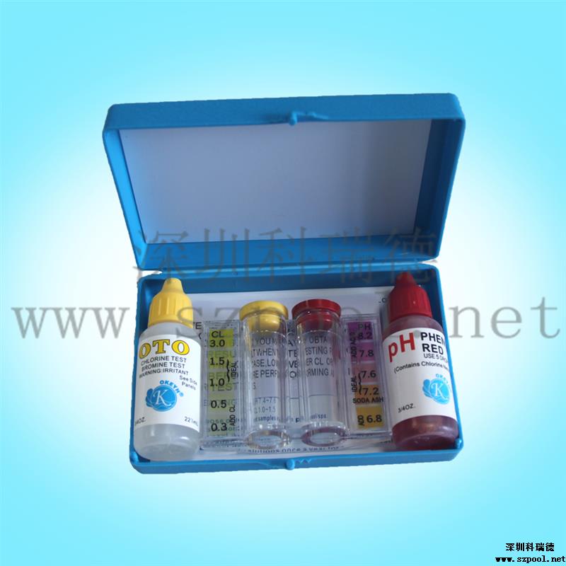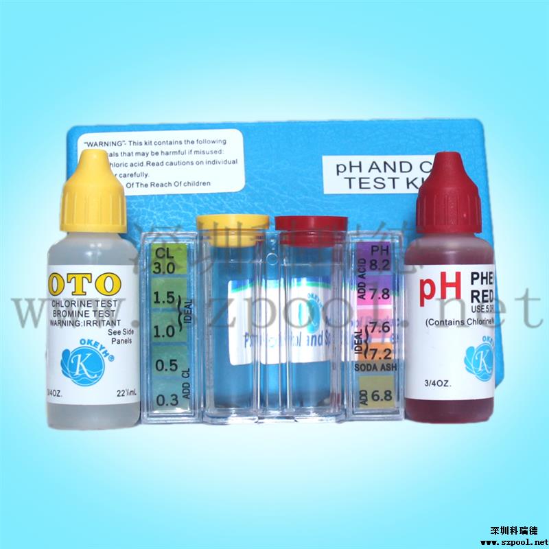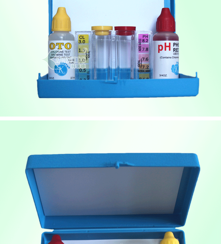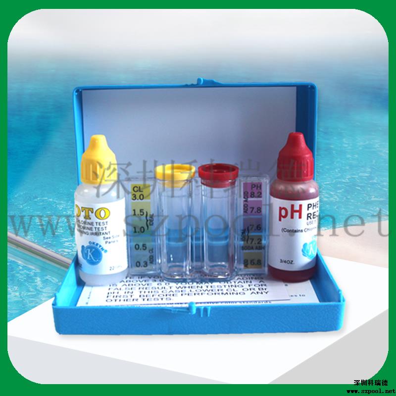 二合一水質(zhì)測試盒包括一個比色皿,一瓶余氯試劑(22ml)及一瓶PH試劑(22ml)。本比色測試計采用目視比色法,操作簡單、方便、快速,檢測指標適合游泳池的水質(zhì)標準,是泳池水質(zhì)處理中常用的水質(zhì)測試比色盒。