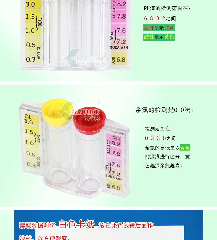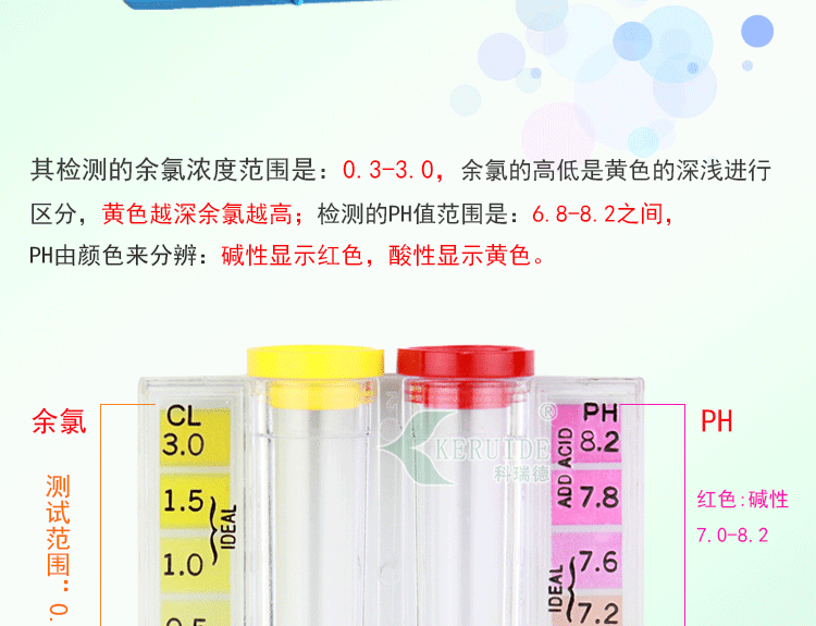 其檢測的余氯濃度范圍是:0.3-3.0mg/L,余氯的高低是黃色的深淺進行區(qū)分,黃色越深余氯越高;檢測的PH值范圍是:6.8-8.2之間,堿性顯示紅色,酸性顯示黃色。