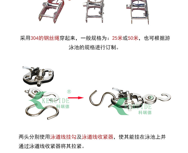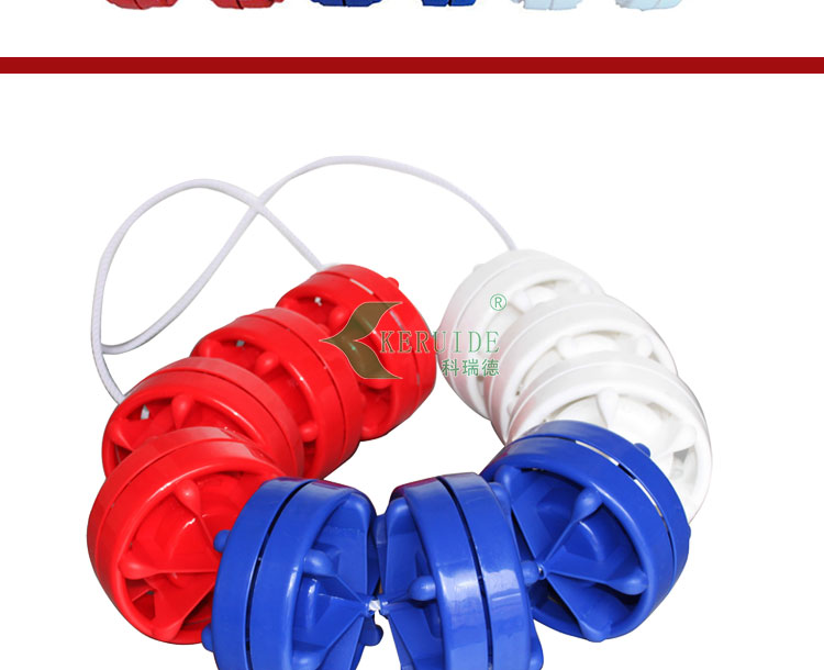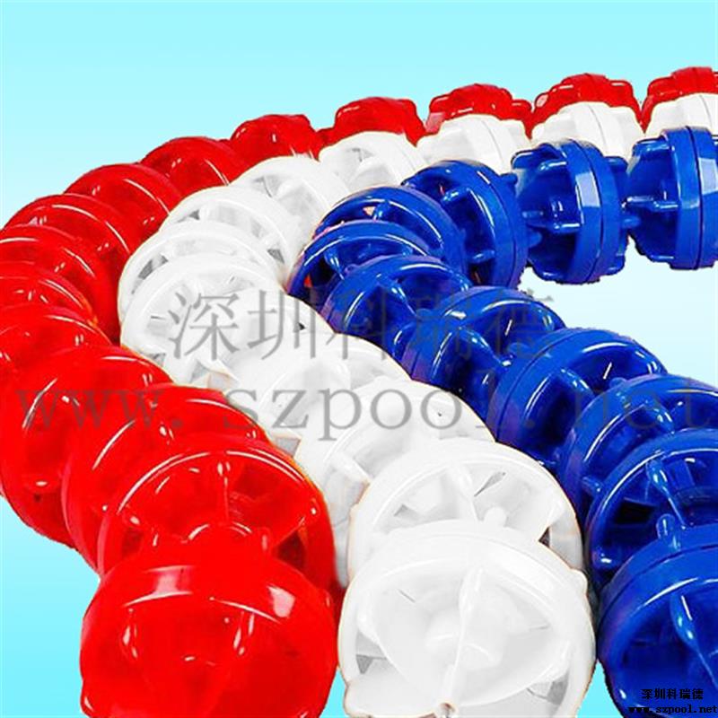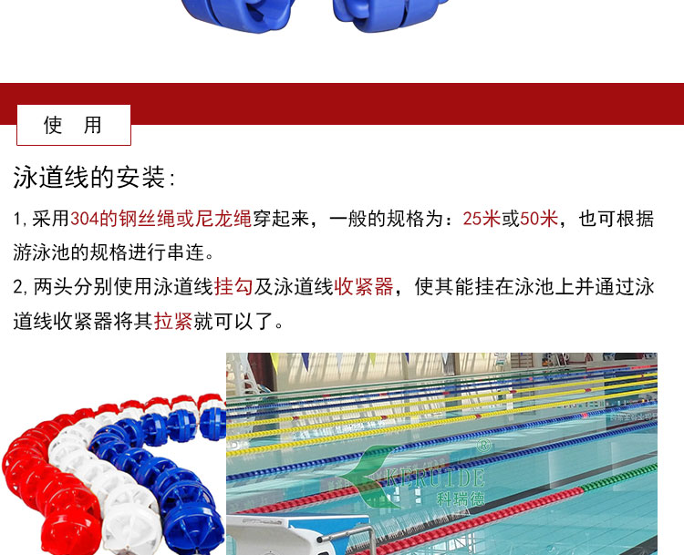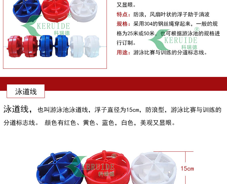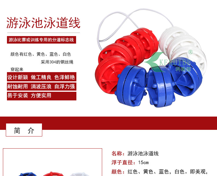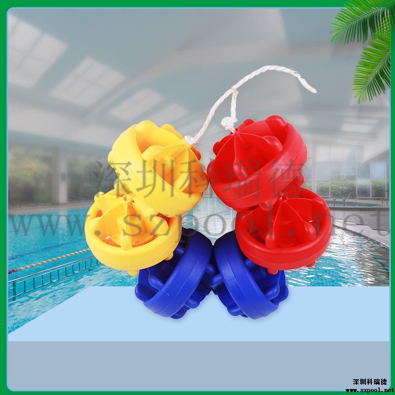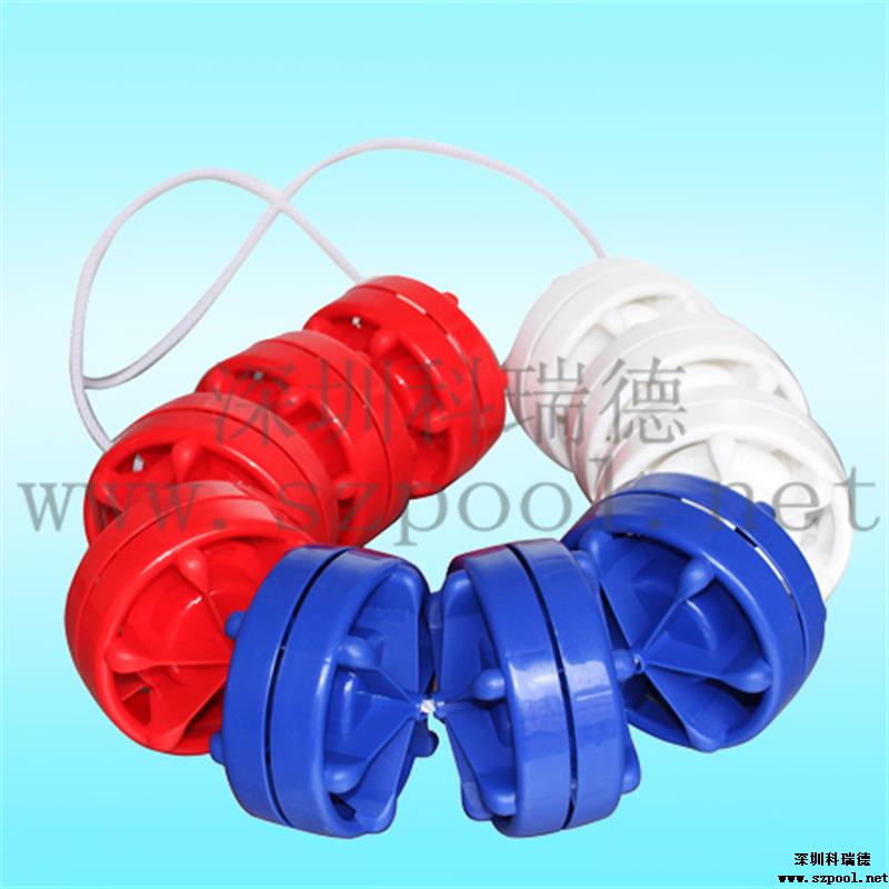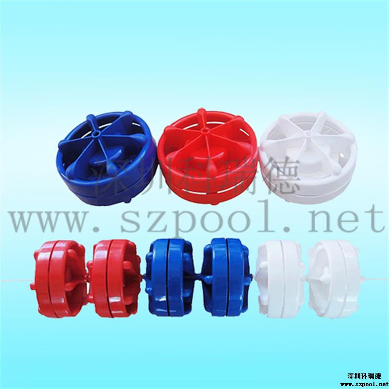 泳道線也叫分水線.直徑為15cm,防浪型.,游泳比賽或訓練的分道標志線。 顏色有紅色、黃色、藍色、白色。采用304的鋼絲繩穿起來,一般的規(guī)格為:25米或50米,也可根據游泳池的規(guī)格進行訂制。兩頭分別使用泳道線掛勾及泳道線收緊器,使其能掛在泳池上并通過泳道線收緊器將其拉緊。