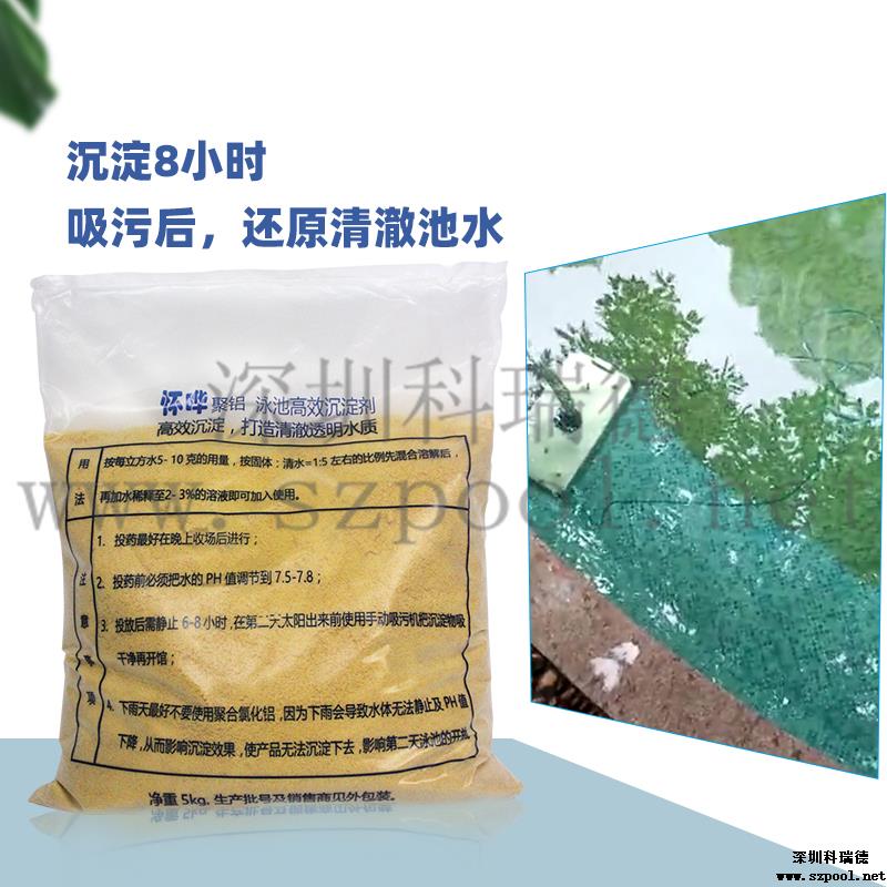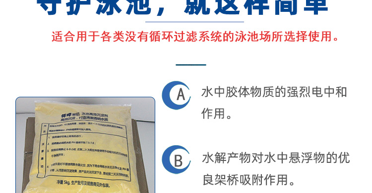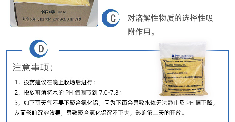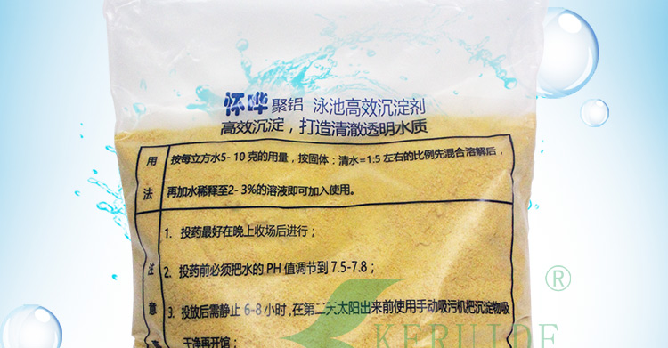【注意事項(xiàng)】:投放游泳池沉淀劑建議在晚上收?qǐng)龊筮M(jìn)行。投放前必須將水的 PH 值調(diào)節(jié)到 7.0-7.8,如下雨天氣不要下沉淀劑,因?yàn)橄掠陼?huì)導(dǎo)致水體無(wú)法靜止及 PH 值下降,從而影響沉淀效果,導(dǎo)致聚合氯化鋁沉不下去,影響第二天的開(kāi)放。