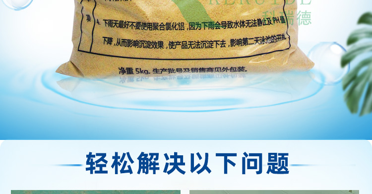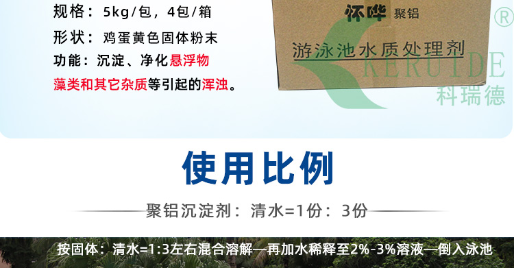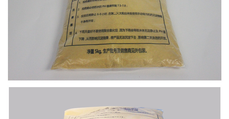 【使用方法】:按每1000立方水5-10KG的用量.使用時(shí)按游泳池沉淀劑(聚合氯化鋁)1份:清水3份的比例先混合溶解后,再加水稀釋到2-3%的溶液即可灑入泳池中使用。