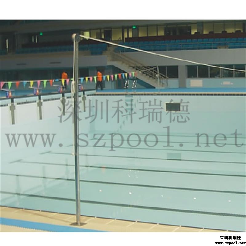 犯規(guī)召回標志線:游泳比賽時用來及時召回搶跳者的裝置。犯規(guī)召回線由兩根不銹鋼插桿及其預埋件、一條帶有若干塑料浮漂的線繩和線繩的快速釋放裝置等組成。