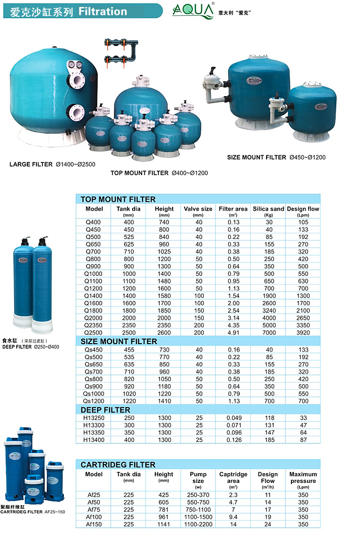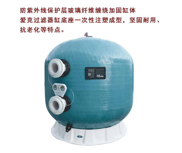愛克沙缸,側(cè)式沙缸,過濾器,它是用于游泳池水過濾的過濾設(shè)備,能去除游泳池水中的懸浮物,使水變澄清.也叫: 泳池過濾沙缸,是組成水循環(huán)過濾系統(tǒng)的重要設(shè)備。