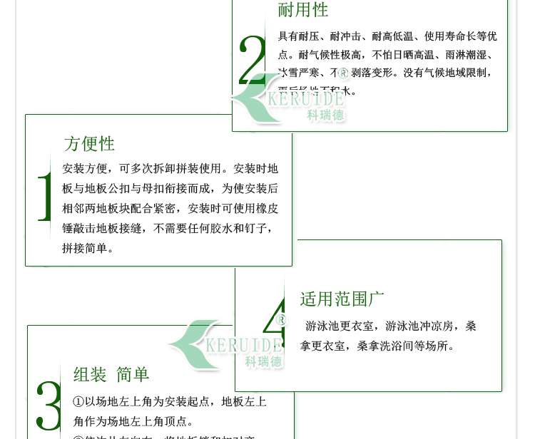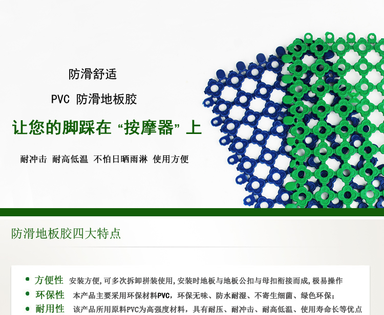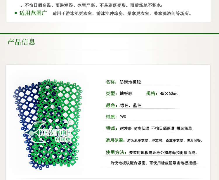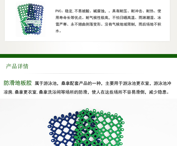 防滑地板膠屬于游泳池,桑拿配套產(chǎn)品的一種,主要用于游泳池更衣室,游泳池沖涼房,桑拿更衣室,桑拿洗浴間等場所的防滑,使人在這些場所不容易滑倒,保證安全.防滑地板膠也叫防滑墊,更衣室防滑墊,游泳池防滑地板膠.