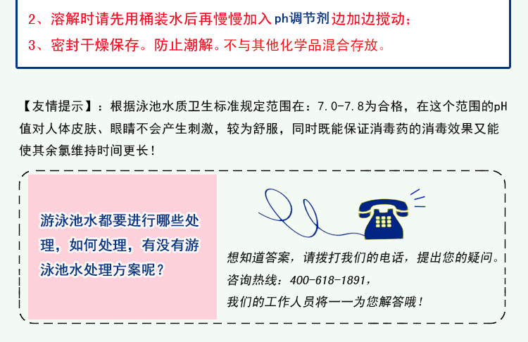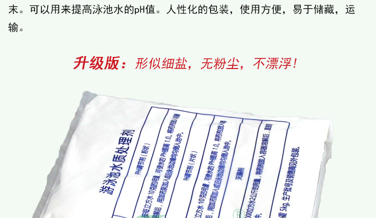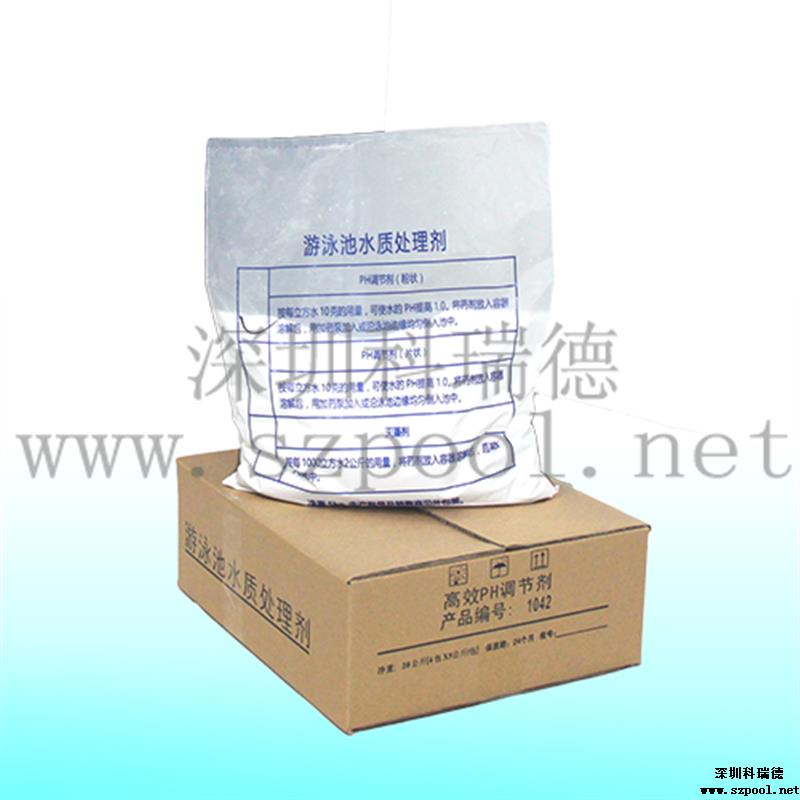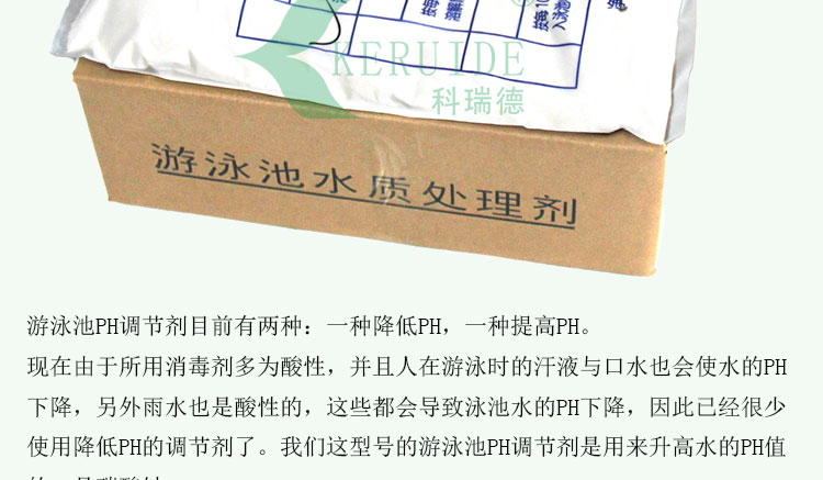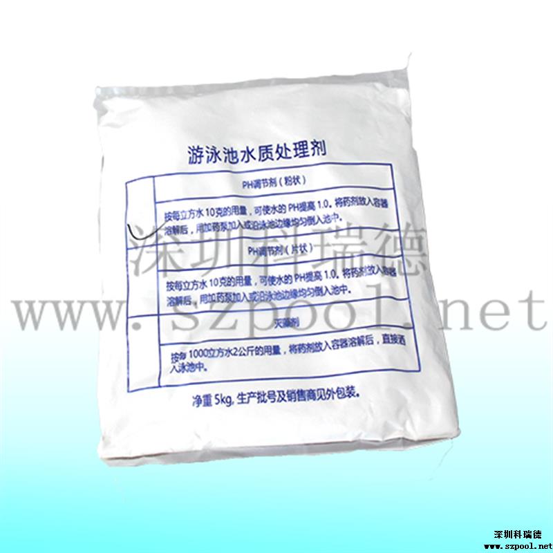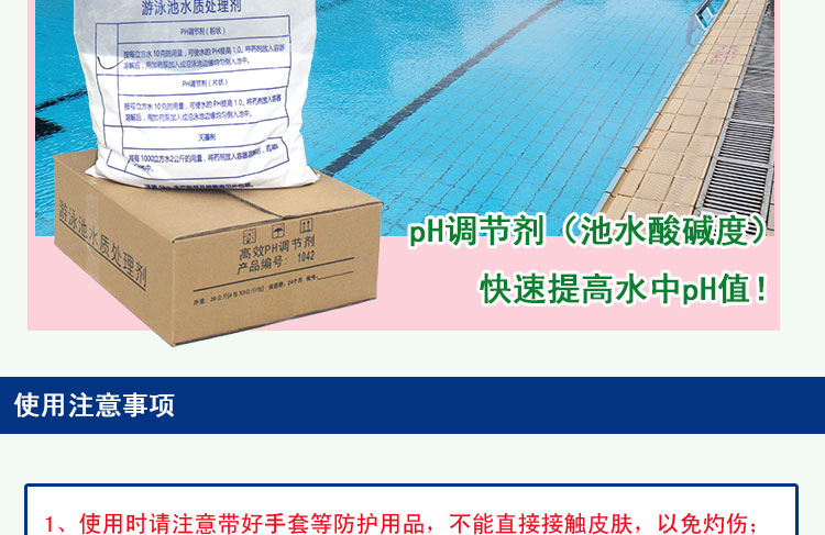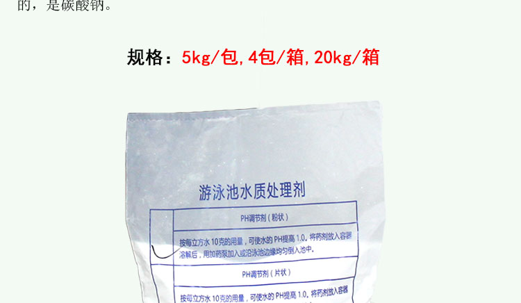 【用法與用量】:使用PH調(diào)節(jié)劑(碳酸鈉)提高泳池水的pH 值時,每升高1.0按每立方水15克的劑量投放。也就是說,加入15公斤的碳酸鈉可使1000立方米水的pH值提升1。