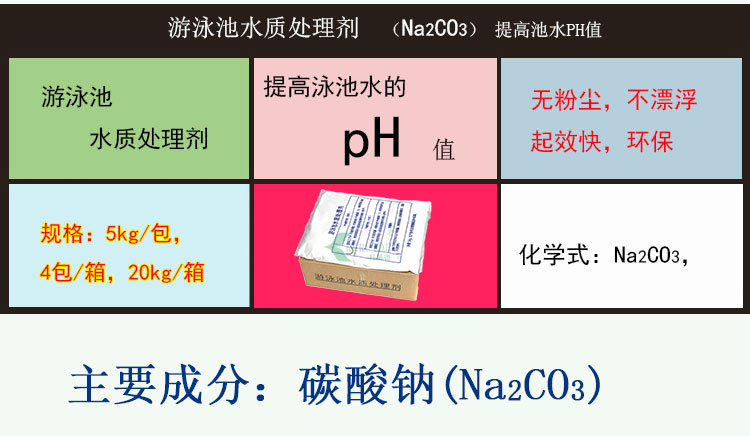 產(chǎn)品主要成分:碳酸鈉,俗名蘇打、純堿、洗滌堿,化學(xué)式:Na2CO3,普通情況下為白色粉末,用于提高游泳池水的PH值,屬于游泳池水處理藥劑的一種。