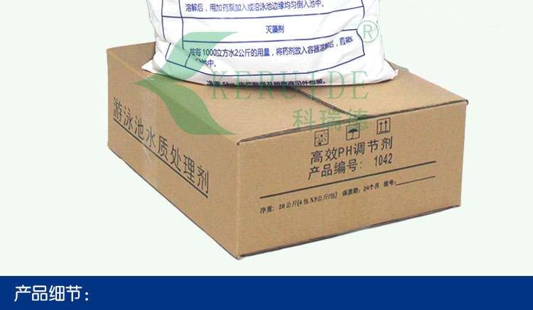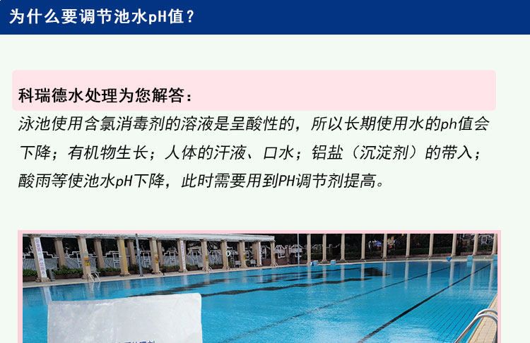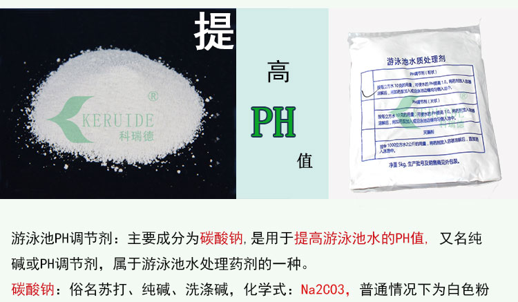本品就屬于游泳池pH調(diào)節(jié)劑中的升高劑,主要成分為碳酸鈉(純堿),其化學(xué)原理為:Na2CO3+ 2HCl(過量)=2NaCl + H2O + CO2↑ ,即碳酸根離子與氫離子反應(yīng)生成二氧化碳?xì)怏w與水,從而綜合水中的氫離子,達(dá)到提高pH的效果。 由于很多游泳池經(jīng)常都要用到消毒劑,而含氯的水溶液是呈酸性的,長期使用會使水的PH下降;另外有機物的生長,人體的汗液、口水,鋁鹽(沉淀劑)的帶入,酸雨等也會使泳池pH下降,此時需要用到PH調(diào)節(jié)劑(碳酸鈉)來升高泳池水的pH值。