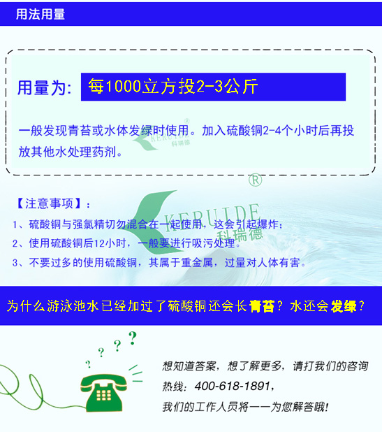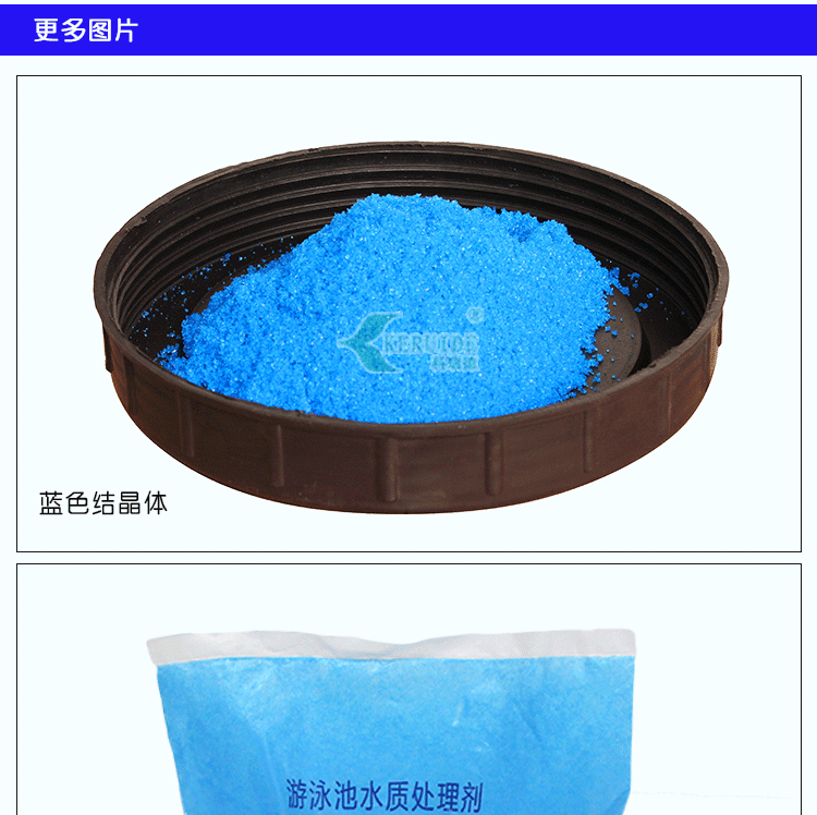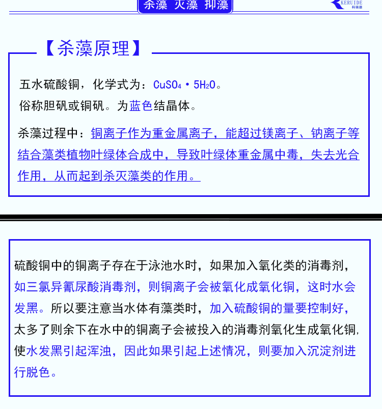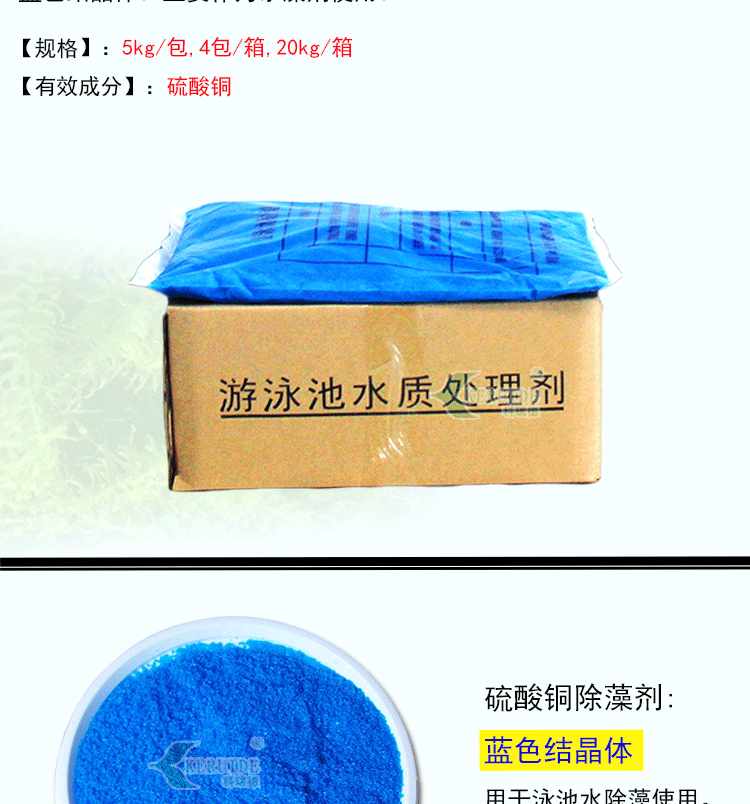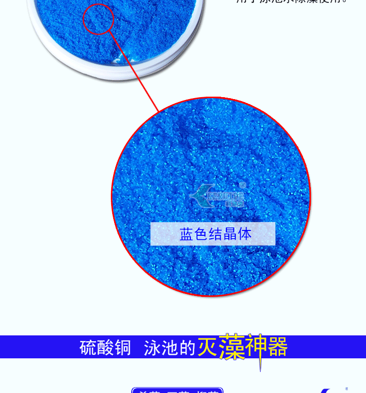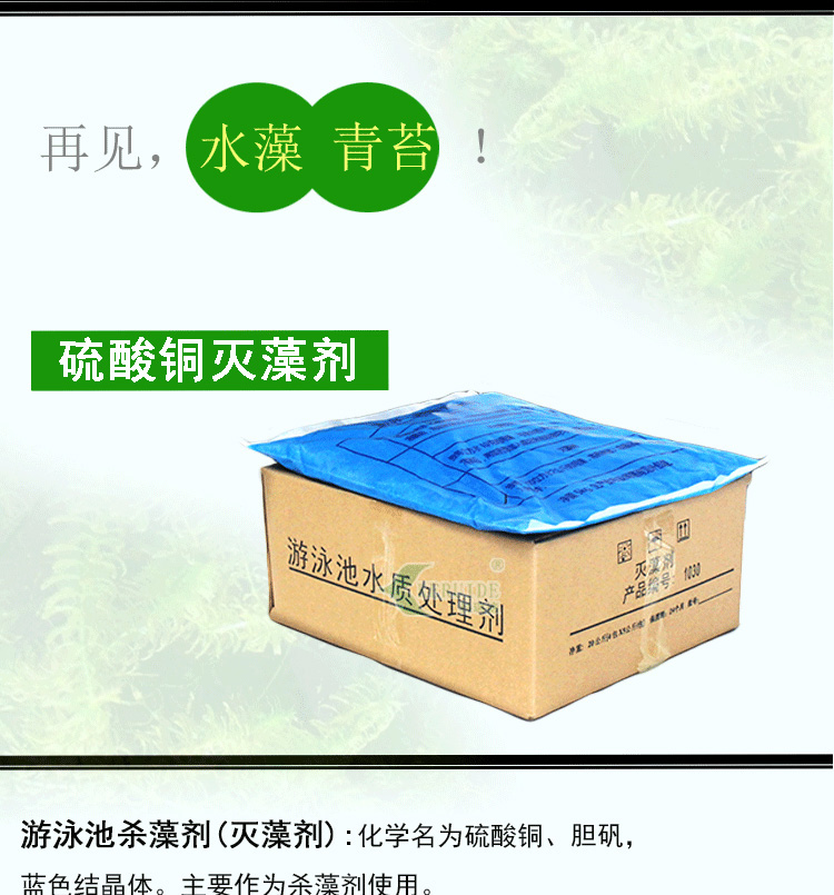 游泳池滅藻劑——屬于游泳池水處理藥劑的一種,化學(xué)名:硫酸銅、膽礬,為藍(lán)色不對(duì)稱三斜晶系結(jié)晶或粉末。主要作為殺藻劑使用,能使殺滅藻類,能有效抑制藻類的生長(zhǎng)。