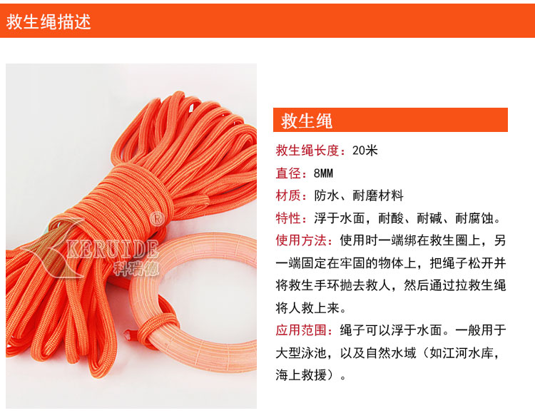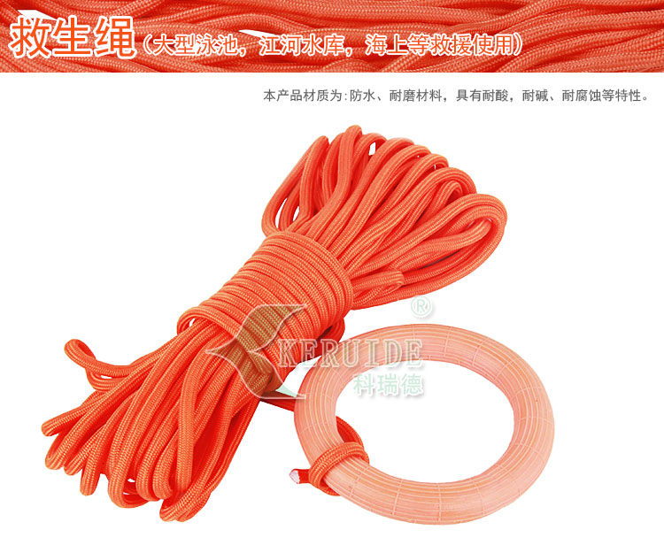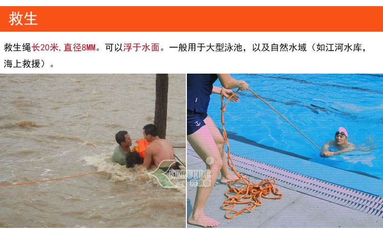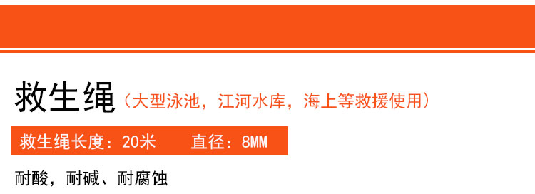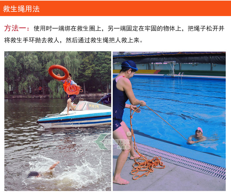 泳池救生繩使用時(shí)一端綁在救生圈上,另一端固定在牢固的物體上,把繩子松開并將救生圈拋去救人,然后通過救生繩拉回救生圈就可以。繩子可以浮于水面。一般用于大型泳池,以及自然水域(如江河水庫,海上救援)。