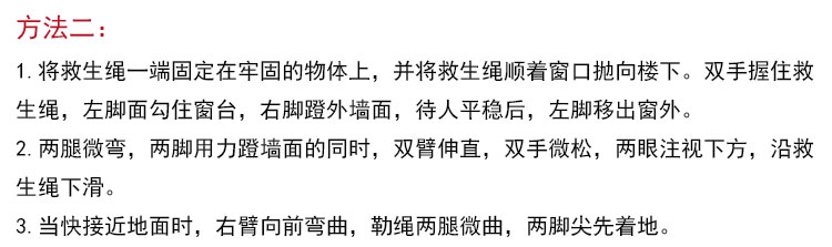 1.將救生繩一端固定在牢固的物體上,并將救生繩順著窗口拋向樓下。雙手握住救生繩,左腳面勾住窗臺,右腳蹬外墻面,待人平穩(wěn)后,左腳移出窗外。