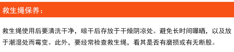 救生繩使用后要清洗干凈,晾干后存放于干燥陰涼處。避免長時(shí)間曝曬,以及放于潮濕處而霉變。此外,要經(jīng)常檢查救生繩,看其是否有磨損或有無斷股。