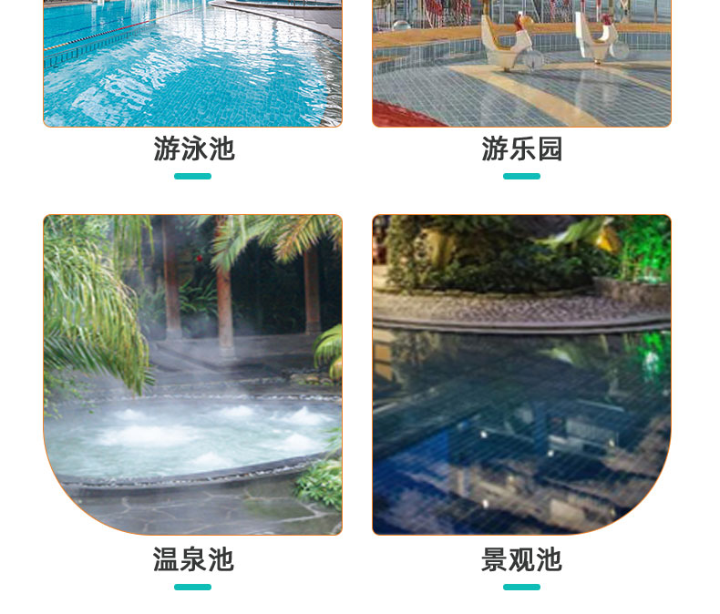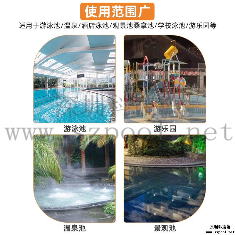 氰尿酸——使用三氯異氰尿酸消毒劑所帶入,能保持余氯的穩(wěn)定,過低則余氯下降很快,過高則使消毒劑不能發(fā)揮消毒效果,導(dǎo)致池水細菌超標、發(fā)白發(fā)綠等。