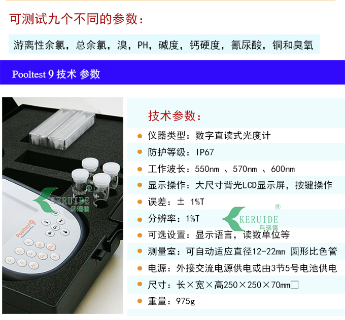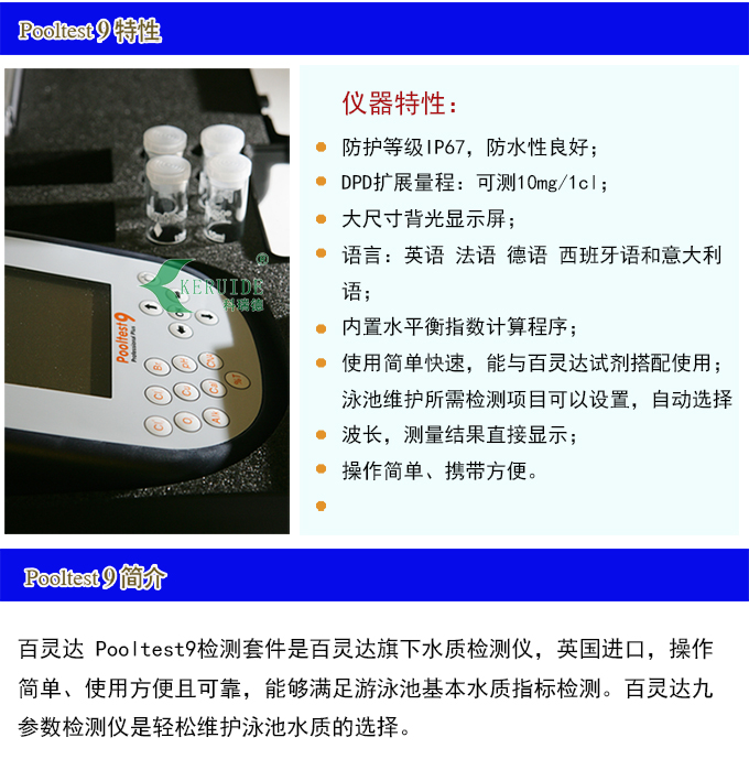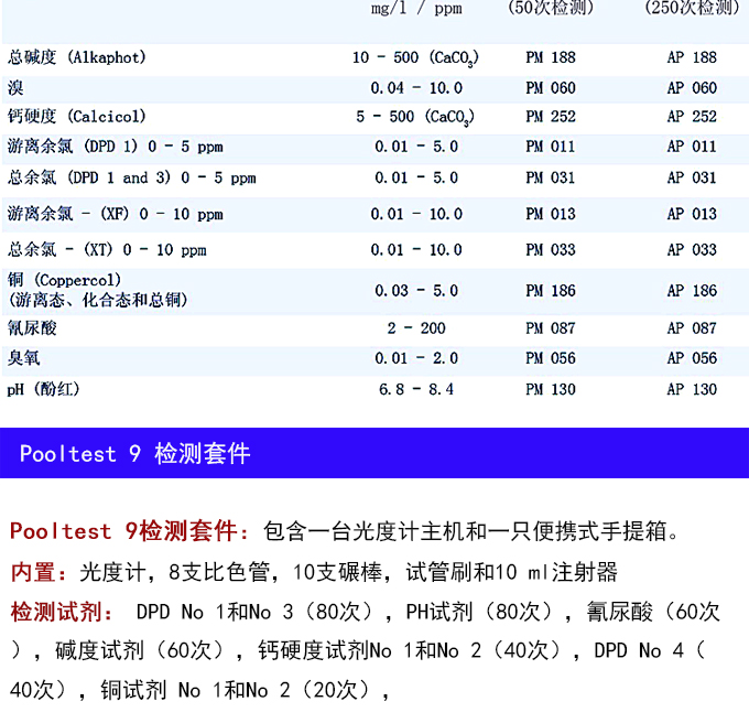 不過百靈達(dá) Pooltest9主要用于泳池水質(zhì)維護(hù),可測(cè)試九個(gè)參數(shù):游離氯,總余氯,溴,PH,堿度,鈣硬度,氰尿酸,銅和臭氧。