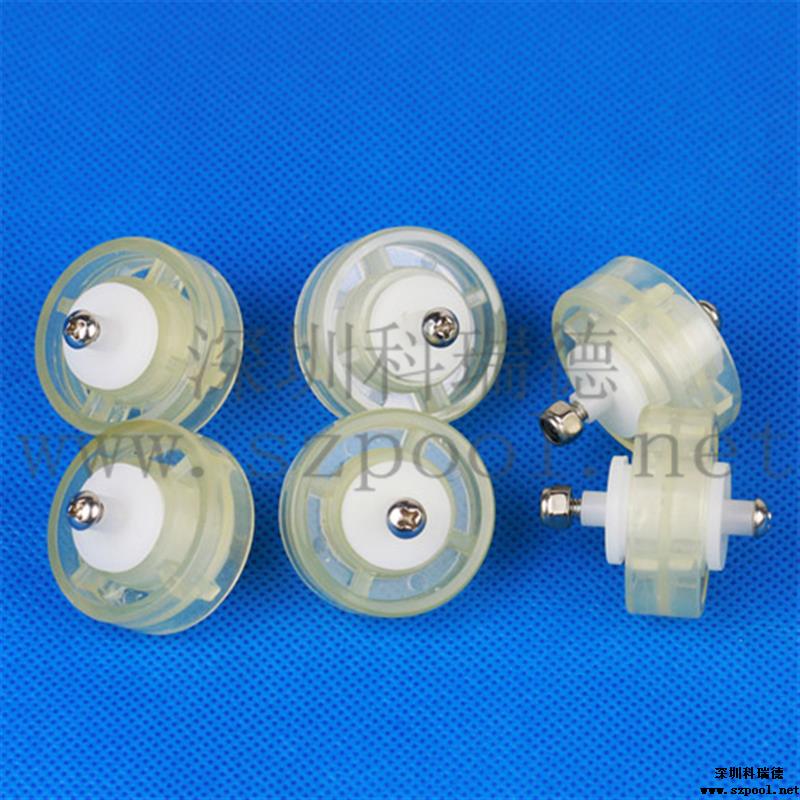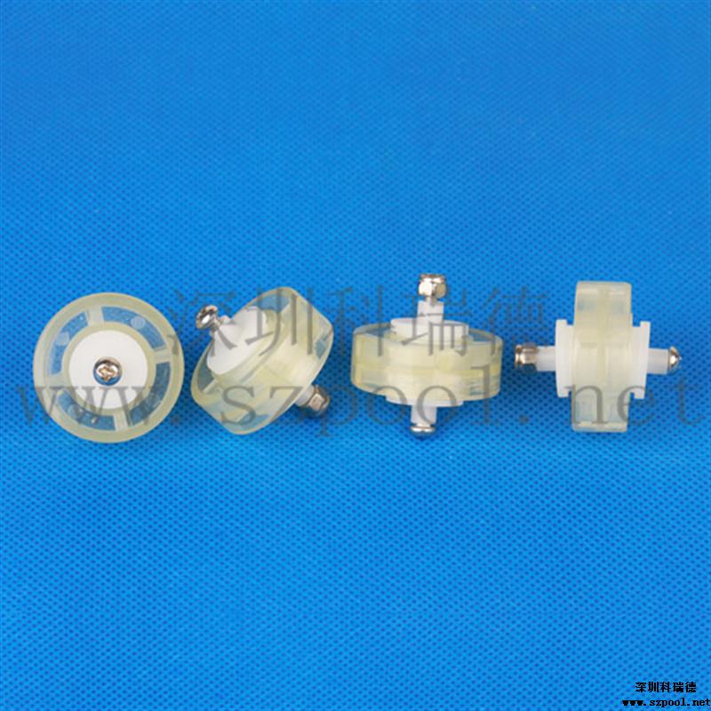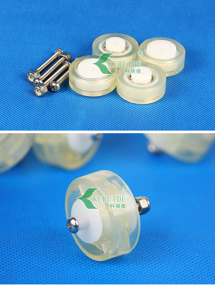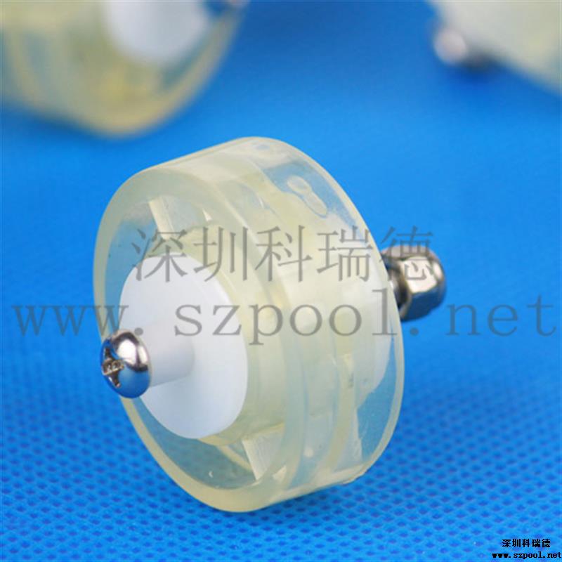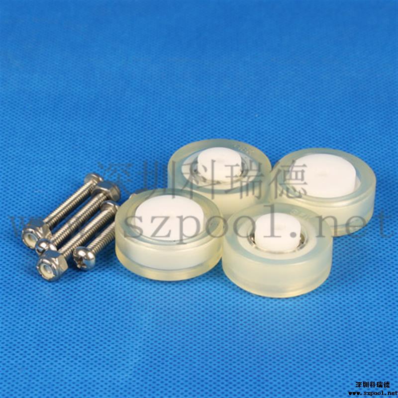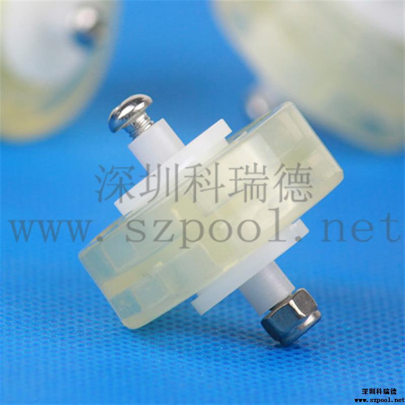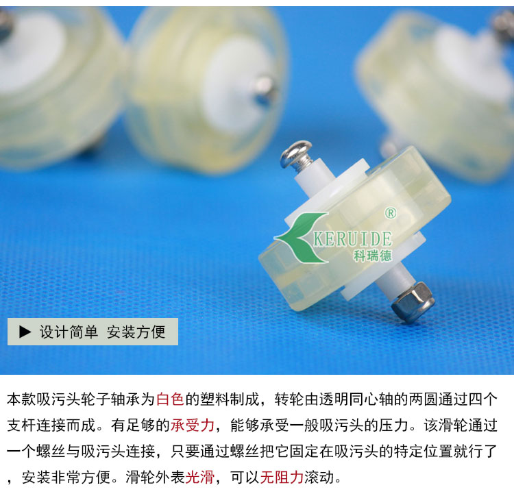 本款吸污頭輪子軸承為白色的塑料制成,轉輪由透明同心軸的兩圓通過四個支桿連接而成。有足夠的度,完全能夠承受一般吸污頭的壓力。該滑輪通過一個螺絲與吸污頭連接,只要通過螺絲把它固定在吸污頭的特定位置就行了,安裝方便?;喭獗砉饣?,可以無阻力滾動。