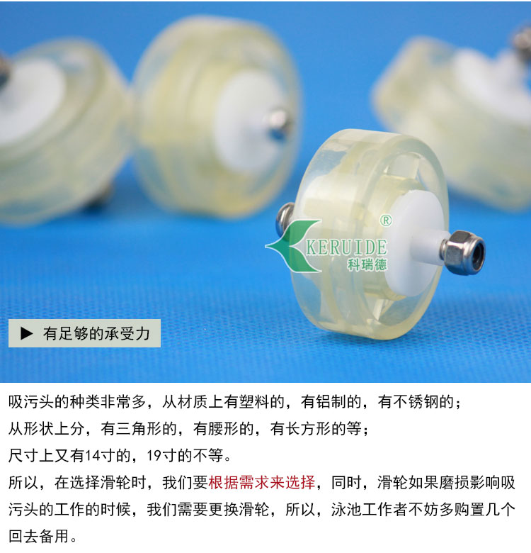 吸污頭的種類多,從材質上有塑料的,有鋁制的,有不銹鋼制的,從形狀上分,有三角形的,有腰形的,有長方形的等,尺寸上又有14寸的,19寸的不等。所以,在選擇滑輪時,我們需要根據(jù)需求來選擇,同時,滑輪如果磨損影響吸污頭的工作的時候,我們需要更換滑輪,所以,泳池工作者不妨多購置幾個回去備用。