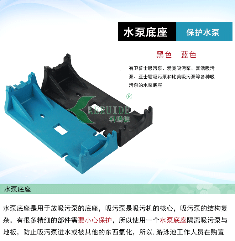 水泵底座是用于承放吸污泵的專用底座,吸污泵是吸污機(jī)的核心,吸污泵的結(jié)構(gòu)復(fù)雜,有很多精細(xì)的部件需要小心保護(hù),所以使用一個(gè)水泵底座隔離吸污泵與地板,防止吸污泵進(jìn)水或被其他的東西氧化,所以,游泳池工作人員在購(gòu)置吸污泵的時(shí)候,一定要記得買一個(gè)水泵底座。