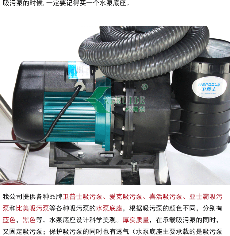 我公司提供各種品牌衛(wèi)普士吸污泵、愛克吸污泵、喜活吸污泵、亞士霸吸污泵和比美吸污泵等各種吸污泵的水泵底座,根據(jù)吸污泵的顏色不同,分別有藍(lán)色,黑色等。水泵底座設(shè)計(jì)科學(xué)美觀。質(zhì)量厚實(shí),在承載吸污泵的同時(shí),固定之;保護(hù)吸污泵的同時(shí)也有透氣(水泵底座主要承載的是吸污泵的馬達(dá))的作用。