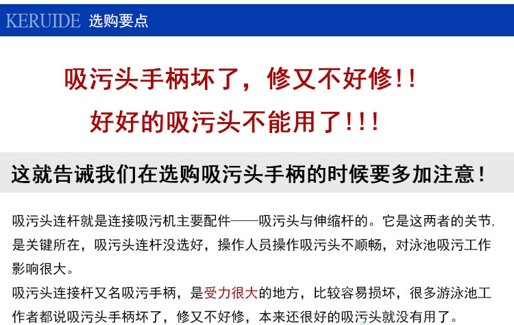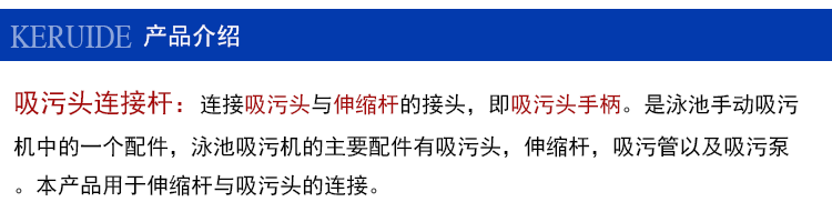 它是吸污機(jī)的配件,吸污機(jī)有很多配件,主要有吸污頭,伸縮桿,吸污管,吸污泵。而吸污頭連桿就是連接吸污機(jī)主要配件——吸污頭與伸縮桿的。它是這兩者的關(guān)節(jié),是關(guān)鍵所在,吸污頭連桿沒選好,操作人員操作吸污頭不順暢,對(duì)泳池吸污工作影響很大。