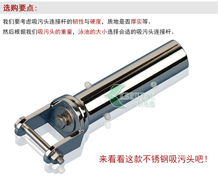本吸污頭連桿對(duì)所有吸污頭尺寸大小都適用,連接伸縮桿的口徑大小也是通用的,所有伸縮桿都可套接!并且它的優(yōu)點(diǎn)是質(zhì)量好,由高質(zhì)量的不銹鋼制成,使用壽命長久,有的大型泳池用的吸污頭有四個(gè)入水口,稱為吸污盤,吸污盤也都是用不銹鋼制成,用普通的塑料吸污頭連桿不能承受這么大的重量,很容易斷裂。此時(shí)需用不銹鋼吸污頭連桿。