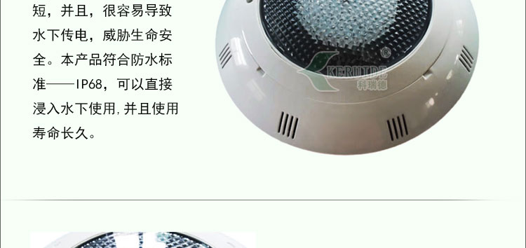防水:水下燈的防水性很重要,如果使用防水性不好的池壁燈,燈的壽命非常短,并且,很容易導致水下傳電,造成安全隱患。本產(chǎn)品符合防水標準——IP68,可以直接浸入水下使用,并且使用壽命長久。