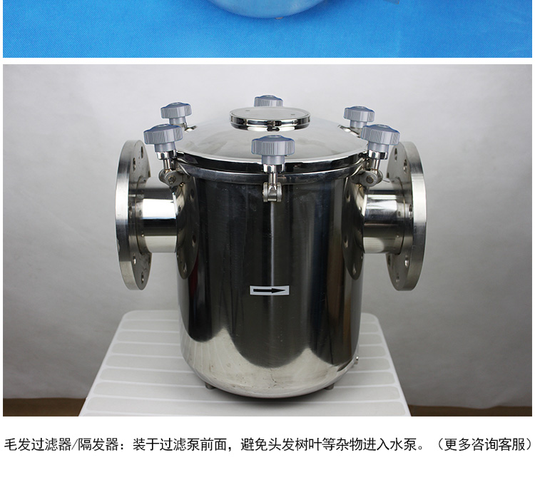 不銹鋼毛發(fā)聚集器,也稱(chēng)毛發(fā)過(guò)濾器,為游泳池、水處理循環(huán)管路系統(tǒng)過(guò)濾而設(shè)計(jì),適用于截留循環(huán)水中的線(xiàn)狀物質(zhì)或顆粒,如毛發(fā)、樹(shù)葉、直徑大于3mm的沙礫等