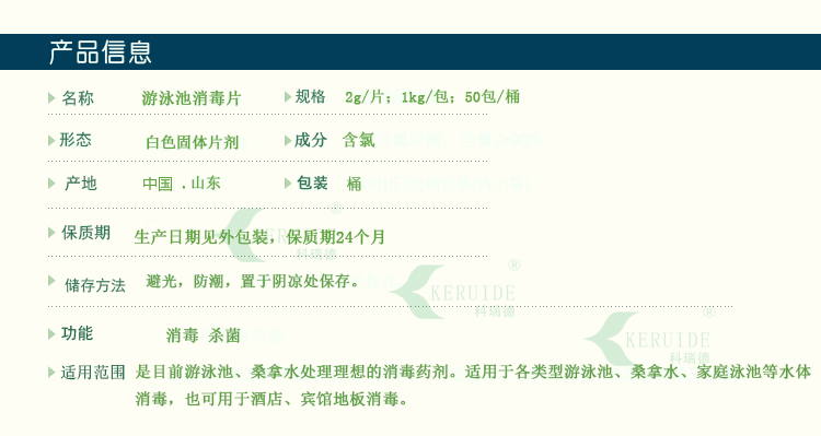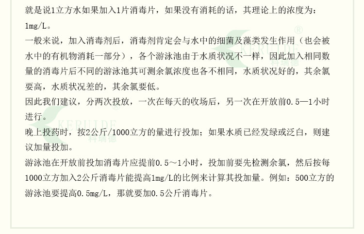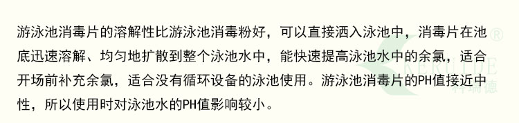 1、游泳池消毒片可以直接灑入泳池中,無(wú)需預(yù)先溶解;