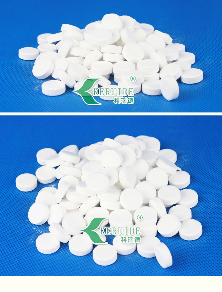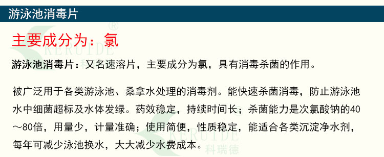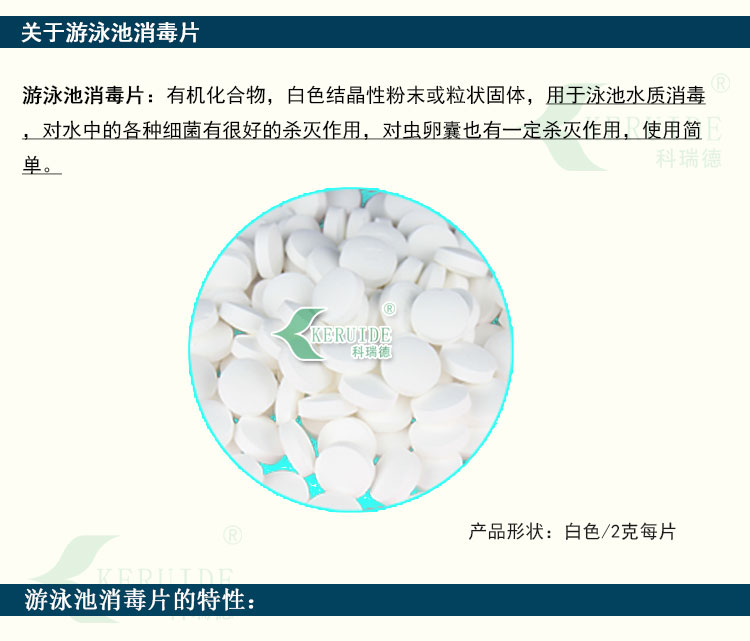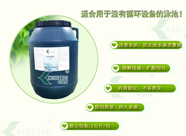 游泳池消毒片的溶解性比游泳池消毒粉好,可以直接灑入泳池中,消毒片在池底迅速溶解,均勻地?cái)U(kuò)散到整個(gè)泳池水中,能快速提高泳池水中的余氯,適合開(kāi)場(chǎng)前補(bǔ)充余氯,并且特別適合沒(méi)有循環(huán)設(shè)備的泳池使用。游泳池消毒片的PH值接近中性,因此使用時(shí)對(duì)泳池水的PH值影響較小。