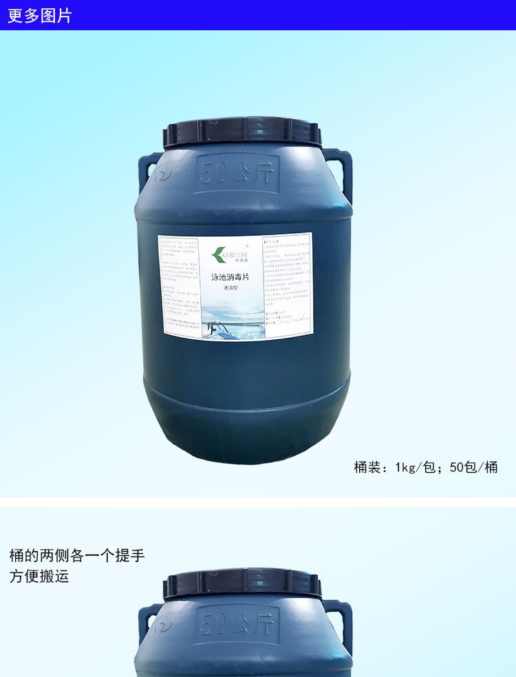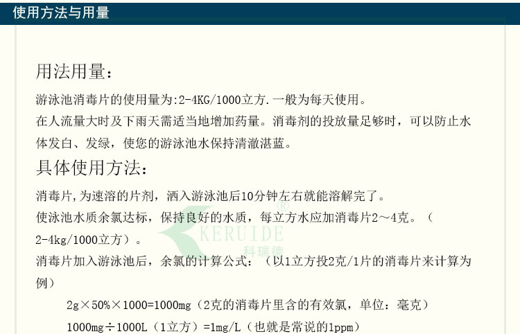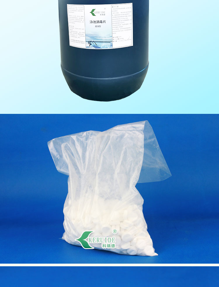 【用法用量】:用于游泳池水消毒時(shí),每天用量約為每1000立方投放2-4公斤,泳客較多或下雨天氣時(shí)要適當(dāng)?shù)卦黾铀幜?。游泳池消毒片的投放量足夠時(shí),可以防止水體發(fā)白、發(fā)綠,使你的游泳池水保持清澈湛藍(lán)。