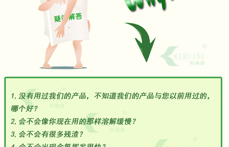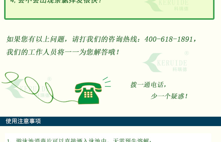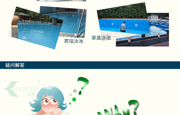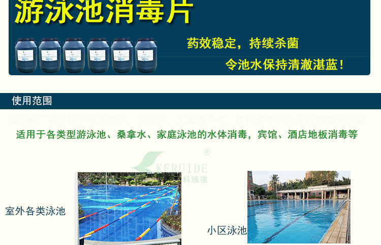 科瑞德速溶游泳池消毒片不僅可以用于日常泳池消毒維護(hù),還可以用于快速補(bǔ)充余氯。一般泳池消毒是在晚上閉館后,以及早上開(kāi)池前2小時(shí)進(jìn)行消毒。夏季天氣熱,余氯揮發(fā)較快,而且夏季游泳的人特別多,對(duì)余氯的消耗也多,一般不到中午余氯就消耗完了。這時(shí)候就要進(jìn)行余氯補(bǔ)充。由于夏季游泳的人多,有人在泳池中就不能投放消毒藥。因此很多泳池會(huì)在中午休息2小時(shí),以便快速補(bǔ)充余氯。那么這時(shí)候就要選擇溶解快的消毒劑,此刻消毒片就是可以快速溶解的,10分鐘左右溶解完,而且可以直接投放進(jìn)泳池中,使用方便。2小時(shí)后再開(kāi)館,余氯達(dá)標(biāo),為泳客們營(yíng)造了健康衛(wèi)生的游泳環(huán)境。