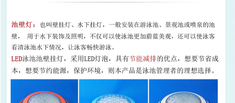 池壁燈:也叫壁掛燈、水下掛燈,一 般安裝在游泳池、景觀池或噴泉的池壁, 用于水下裝飾及照明,不僅可以使泳池更加蔚藍美觀,還可以使泳客看清泳池水下情況,讓泳客暢快游泳。