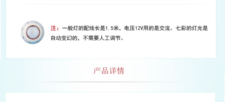適合場所:應(yīng)用于各種噴泉、水池、游泳池及魚缸等照明裝飾。