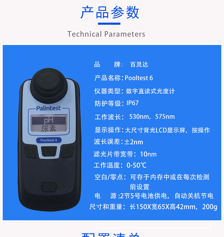 對泳池進(jìn)行日常檢查維持消毒效果和ph控制很重要。百靈達(dá)檢測儀Pooltest6提供了一個水處理的解決方案,一款檢測快速且可靠的光度計(jì),能夠檢查9種不同的參數(shù)。而且此款儀器可檢測尿素,所以也叫做尿素檢測儀。