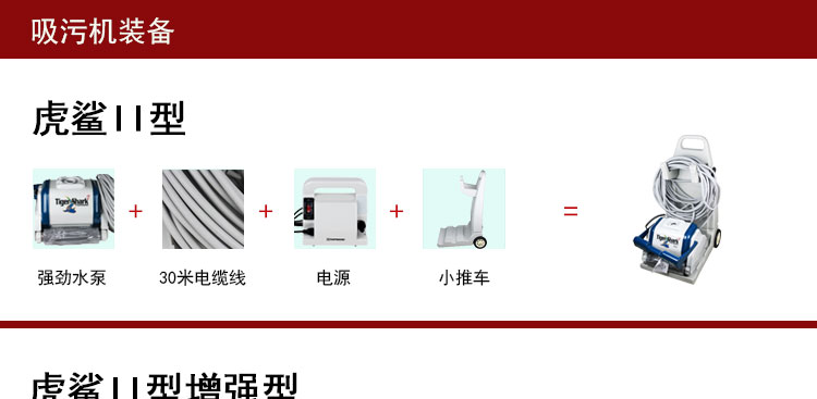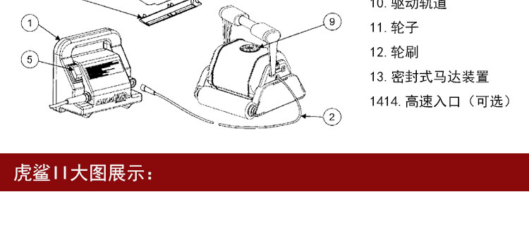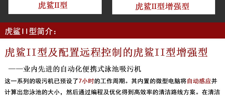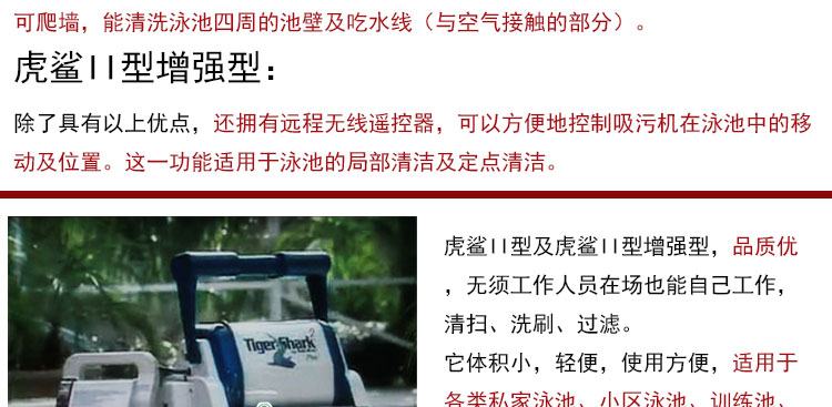 虎鯊全自動(dòng)吸污機(jī)Tiger SharkⅡ是游泳池吸污機(jī)的一種,與彩鯊吸污機(jī)和帝鯊吸污機(jī)是同一個(gè)系列,其安全性好、耗電量低、操作簡(jiǎn)單、并且自帶小推車,便于使用及保存。吸污力強(qiáng)、爬行性能好、使用壽命長(zhǎng)是其與優(yōu)于其他品牌吸污機(jī)的特點(diǎn)。虎鯊自動(dòng)吸污機(jī)無(wú)須工作人員在場(chǎng)也能自己工作,清掃、洗刷、過(guò)濾,讓您的泳池干凈看得見!