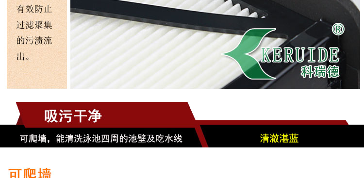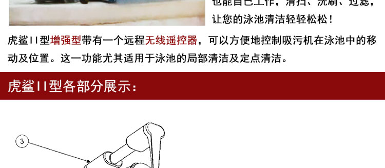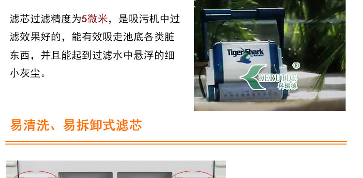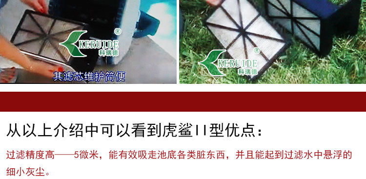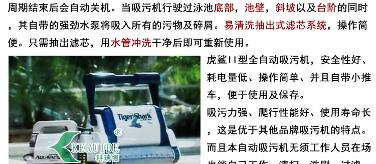 【優(yōu)點(diǎn)】:虎鯊吸污機(jī)的過(guò)濾精度為5微米,是所有吸污機(jī)中過(guò)濾效果較好的,能有效吸走池底各類臟東西,并且能起到過(guò)濾水中懸浮的細(xì)小灰塵。