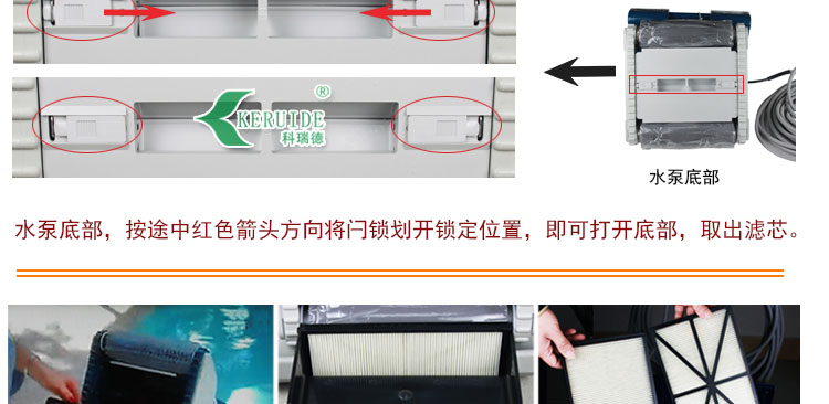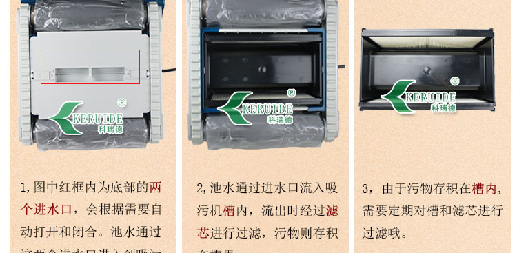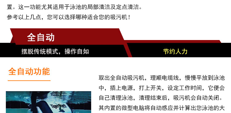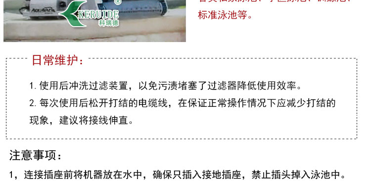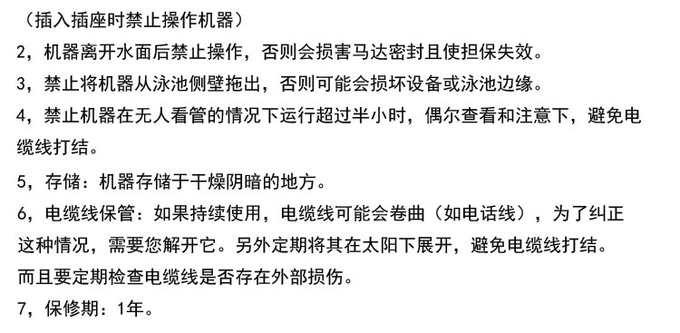 【用法】:取出虎鯊全自動(dòng)吸污機(jī)理順電纜線,慢慢平放到泳池中,插上電源,打上開關(guān),設(shè)定工作時(shí)間,它便會(huì)自己清理泳池,清理結(jié)束后,取出濾芯,用清水輕輕沖洗,晾干放回原位。初次使用時(shí)請(qǐng)按設(shè)定長(zhǎng)時(shí)間進(jìn)行吸污,讓其運(yùn)行完一個(gè)完整的周期,讓其能記憶泳池的大小,在下次運(yùn)行時(shí)路線更合理。