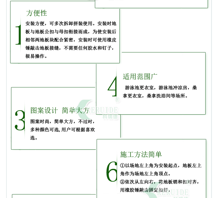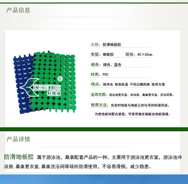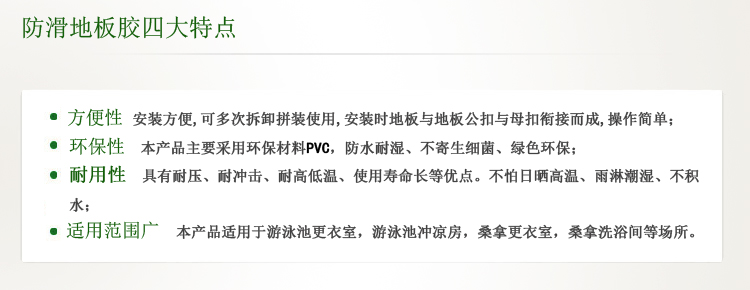 防滑地板膠屬于游泳池,桑拿配套產(chǎn)品的一種,主要用于游泳池更衣室,游泳池沖涼房,桑拿更衣室,桑拿洗浴間等場所的防滑,使人在這些場所不容易滑倒,保證安全.