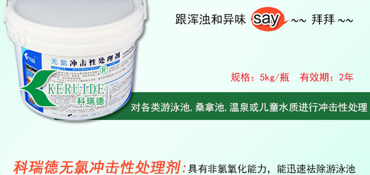 科瑞德無(wú)氯沖擊性處理劑,是不含氯的泳池消毒劑,無(wú)異味不刺激的泳池消毒劑。【規(guī)格】:5kg/桶??? 【有效期】:2年