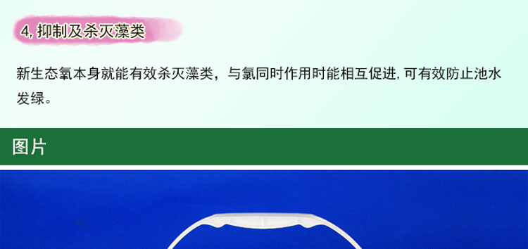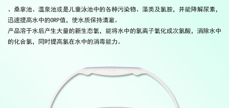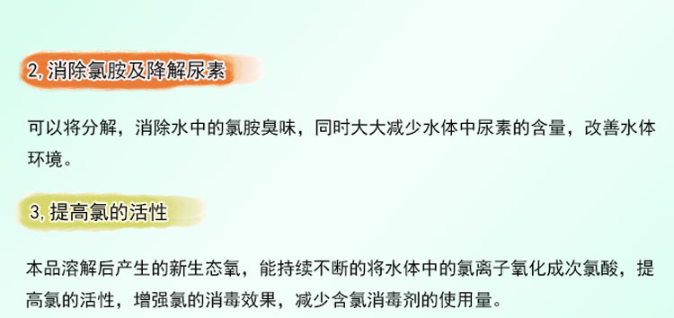 產(chǎn)品溶于水后產(chǎn)生新生態(tài)氧,能將水中的氯離子氧化成次氯酸,消除水中的化合氯,同時(shí)提高氯在水中的消毒能力。