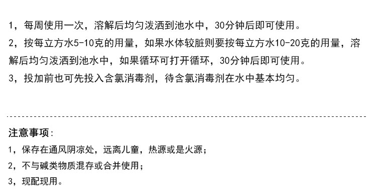 2,按每立方水5-10克的用量,如果水體較臟則要按每立方水10-20克的用量,溶解后均勻潑灑到池水中,如果循環(huán)可打開循環(huán),30分鐘后即可使用。