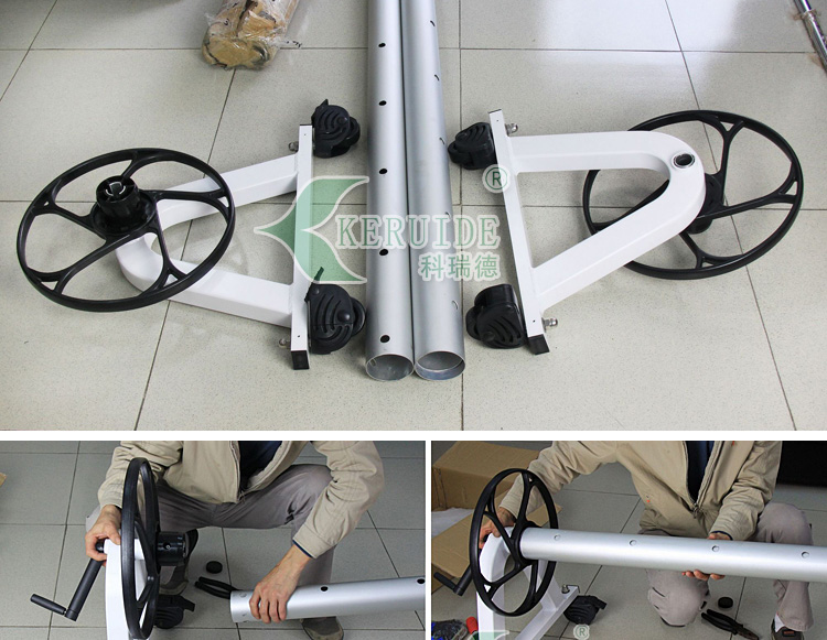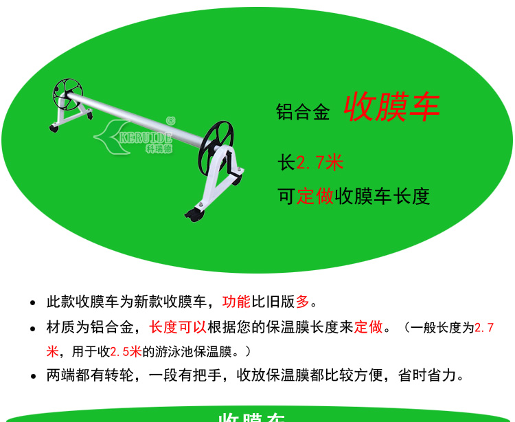保溫膜收膜車:用于收放泳池保溫膜的。本款保溫膜收膜車采用強(qiáng)韌鋁合金制成,質(zhì)量可靠,耐腐蝕,使用壽命長久。造型簡單,使用方便。