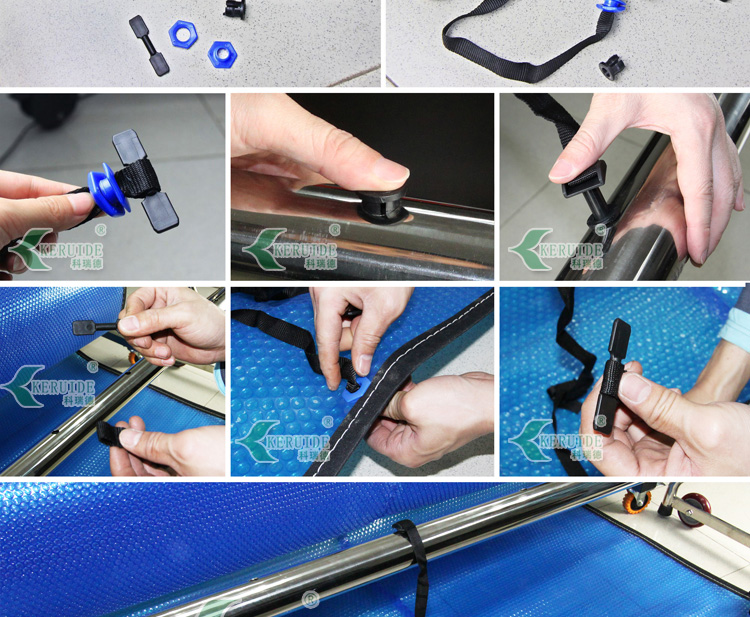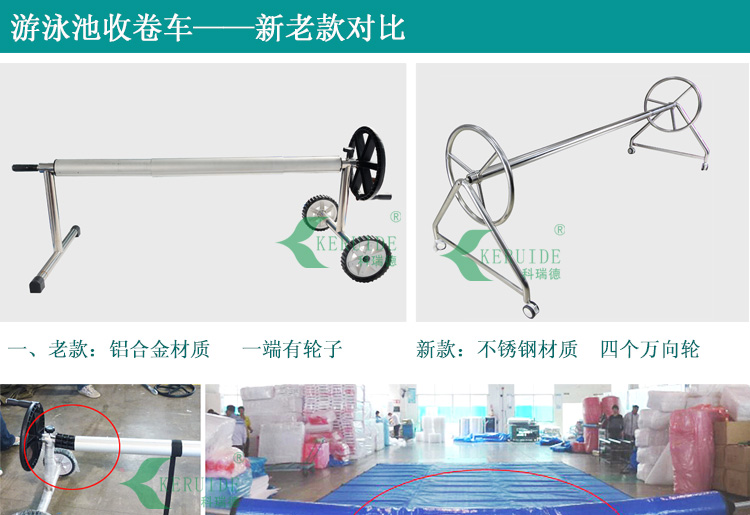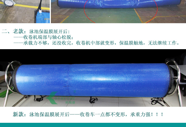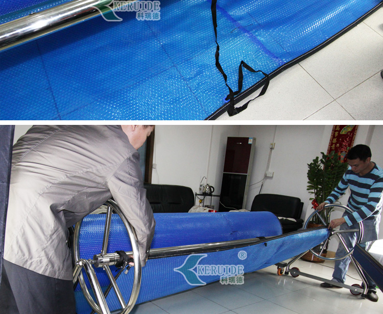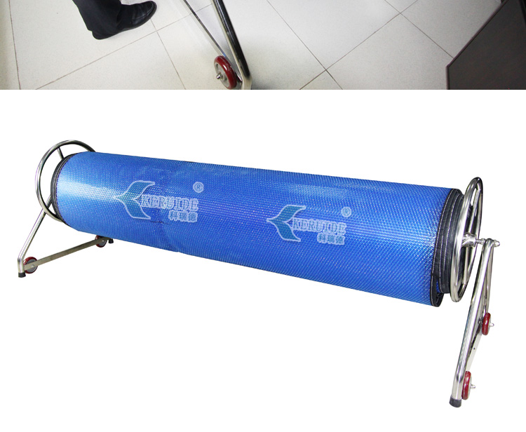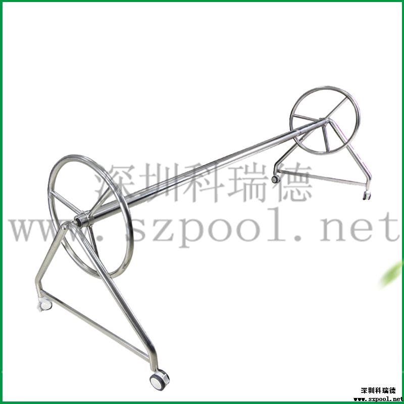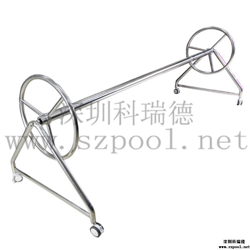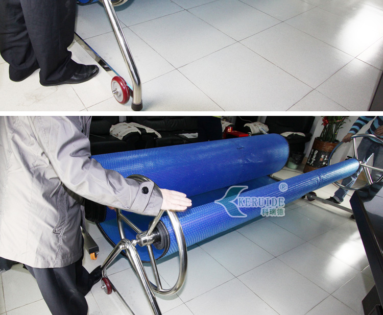 【保溫膜收膜車】:用于收放泳池保溫膜的。本款保溫膜收膜車采用不銹鋼制成,耐腐蝕,使用壽命長久。造型簡單,使用方便。?保溫膜收膜車是用來收放保溫膜的,保溫膜是用于夜間泳池不使用時保持泳池溫度用的,保溫膜還可以防止灰塵落入泳池,減少清潔成本。使用保溫膜對泳池保溫,可以減少白天加熱泳池水溫,能減少加熱成本。當(dāng)保溫膜不使用的時候,我們需要將其卷起來保存,方便保溫膜再次使用。所以,建議購買了保溫膜的泳池配套使用保溫膜收膜車。