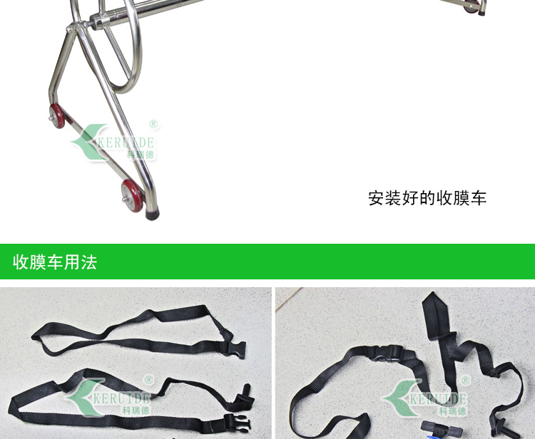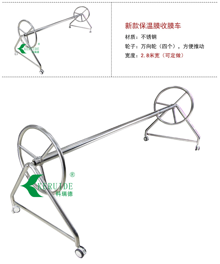 2,保溫膜收膜車的高度:高度要適中,太高沒有必要,太矮的話保溫膜會貼到地上。所以要收完50米長的保溫膜后,保溫膜距地面的高度還要有15-20cm比較合適。