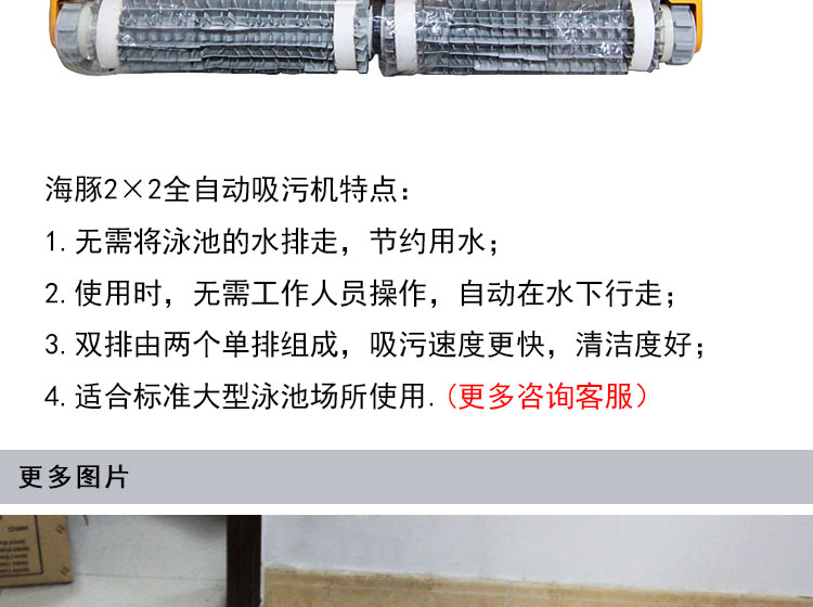 海豚2X2雙排吸污機由美國進口,配40米線:足夠長的線,適合幾乎所有的游泳池用,帶遙控:可選擇人工控制吸污機的運行,清潔更有目的性。可編程:可根據(jù)游泳池的大小設(shè)定不同的模式,靈活方便。