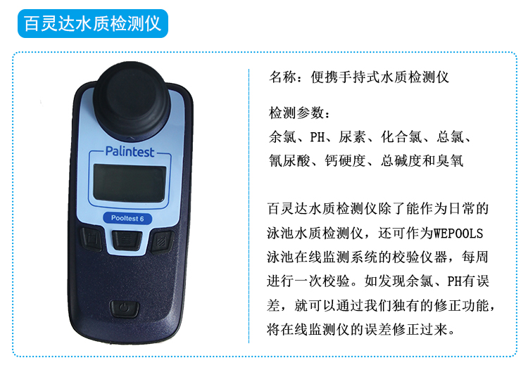 如下圖就是英國(guó)百靈達(dá)水質(zhì)監(jiān)測(cè)儀,廣泛用于現(xiàn)場(chǎng)檢測(cè)泳池水的余氯、PH值。因此,我們建議游泳池也使用百靈達(dá)水質(zhì)檢測(cè)儀作為校驗(yàn)儀器,每周進(jìn)行一次校驗(yàn)。