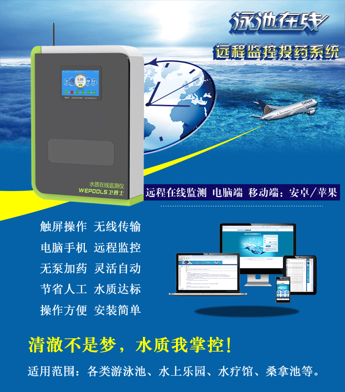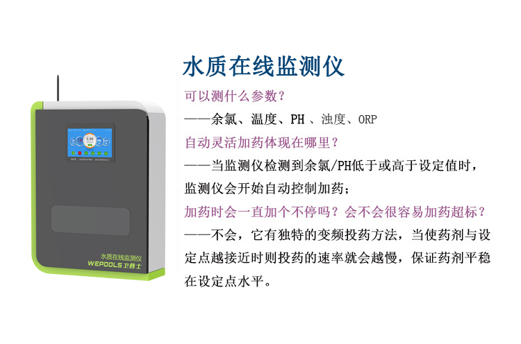 智能化全自動(dòng)水質(zhì)監(jiān)控系統(tǒng):游泳池余氯PH在線監(jiān)測(cè)儀,也叫泳池余氯PH在線檢測(cè)儀,實(shí)時(shí)在線監(jiān)控泳池水的余氯和PH、溫度,自動(dòng)控制加藥,讓余氯PH時(shí)刻保持在設(shè)定值,簡(jiǎn)單方便,節(jié)省消毒藥和減少人工,保證泳池水質(zhì)穩(wěn)定達(dá)標(biāo)。