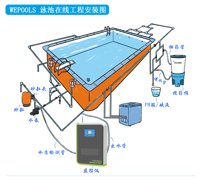 WEPOOLS泳池在線監(jiān)測(cè)系統(tǒng)安裝簡(jiǎn)單,投藥桶與監(jiān)測(cè)儀的進(jìn)出水管道都是安裝在循環(huán)管道中,如下圖所示: