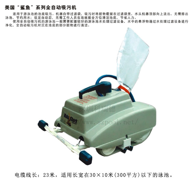 優(yōu)點(diǎn):美國"鯊魚"系列全自動吸污機(jī)適用于游泳池、景觀水、溫泉等的池底吸污。全自動吸污機(jī)的運(yùn)作過程其實(shí)是一樣的,只要將其放入泳池中便可自動運(yùn) 行,不需要人工程操作,鯊魚的自帶過濾袋,不需要過濾軟管等附帶設(shè)備連接,吸污時(shí)將贓物截留在過濾袋里,水從機(jī)器頂部向上流出,在清潔的過程中節(jié)約用水; 設(shè)定自動后,無需工作人員在場就能全方位清潔池底,節(jié)省人力 。